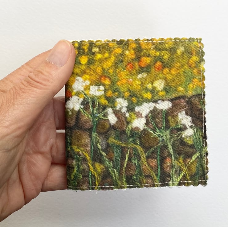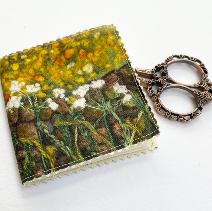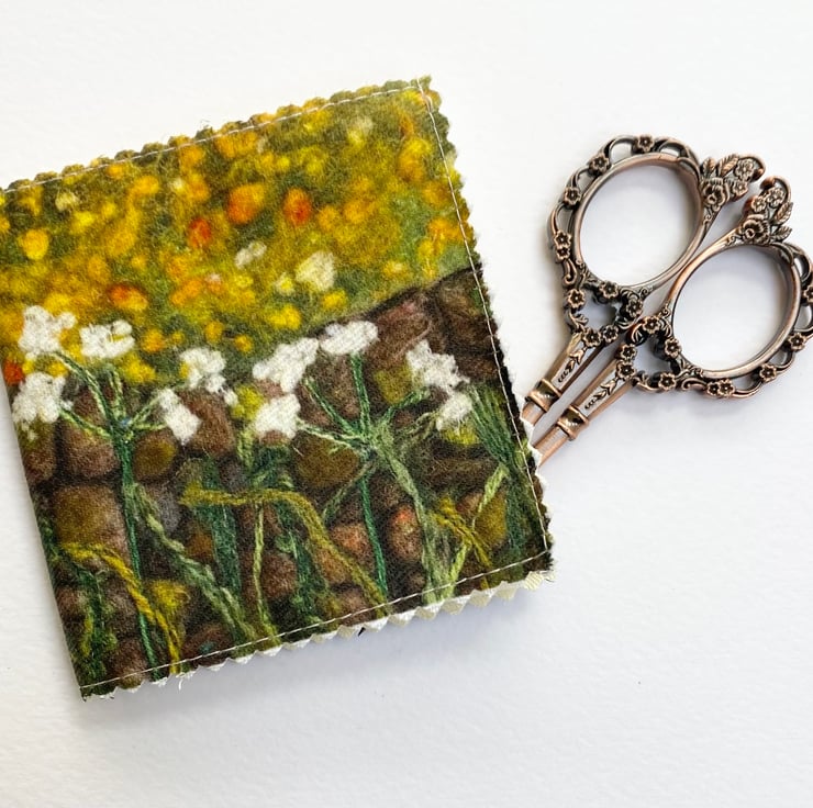 This bright and sunny needle and pins case shows a printed scene from one of my Yorkshire scenes. This one shows a dry stone wall with buttercups beyond and meadow sweet in front. It’s ideal for anyone who sews.