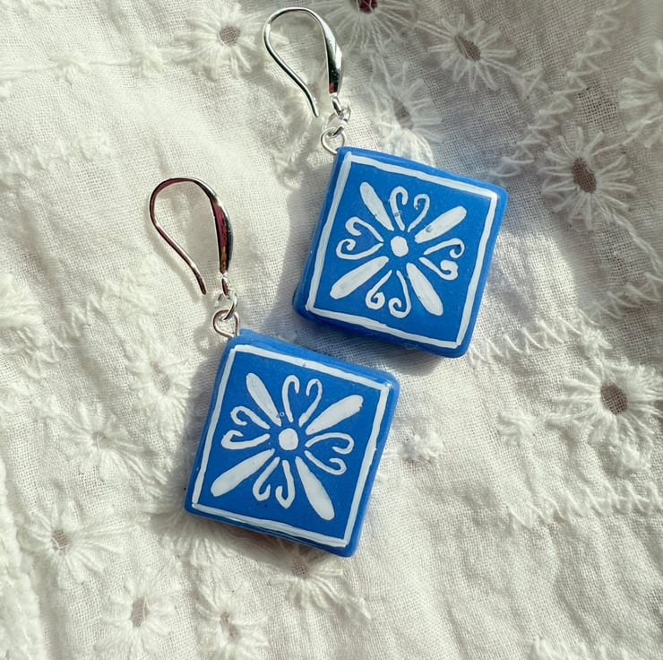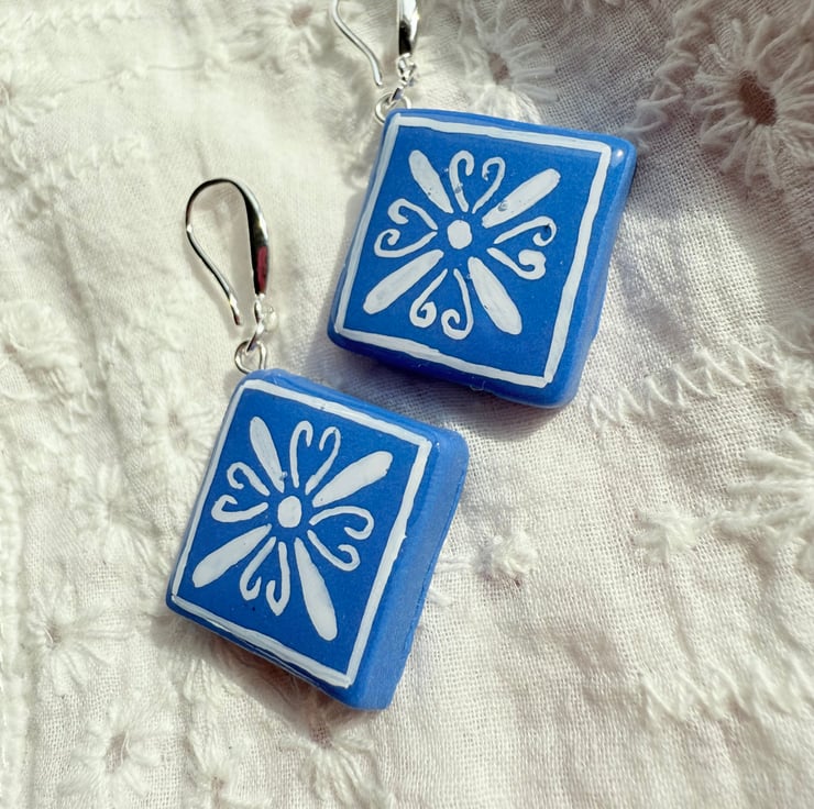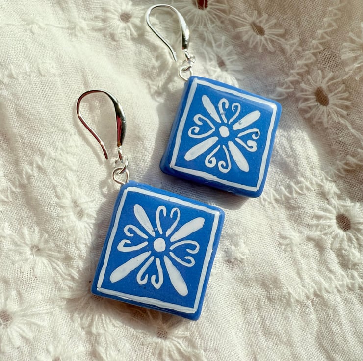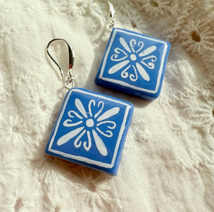 Like tiny treasures plucked from a sunlit Portuguese courtyard, these earrings celebrate the timeless beauty of hand-painted tiles. Each square is made from Cornflower Blue clay and hand painted with a white folk-style floral framed by a border—echoing the azulejos that line Algarve streets and gardens.