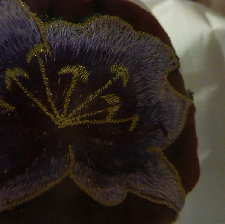This is a luxury padded claret red figured velvet sleep mask with a pure cotton lining . It is decorated with a vibrant flower embroidered panel, sewn on not glued, and the edge trimmed with gold piping. It has black lingerie quality lace, one side is lace the other with skin sensitive padding, The elasticated lace is fully adjustable and the mask is fully light proof ensuring a peaceful night or day sleep. All the masks I make are unique, I sew to relax and have a low borebom threshold.