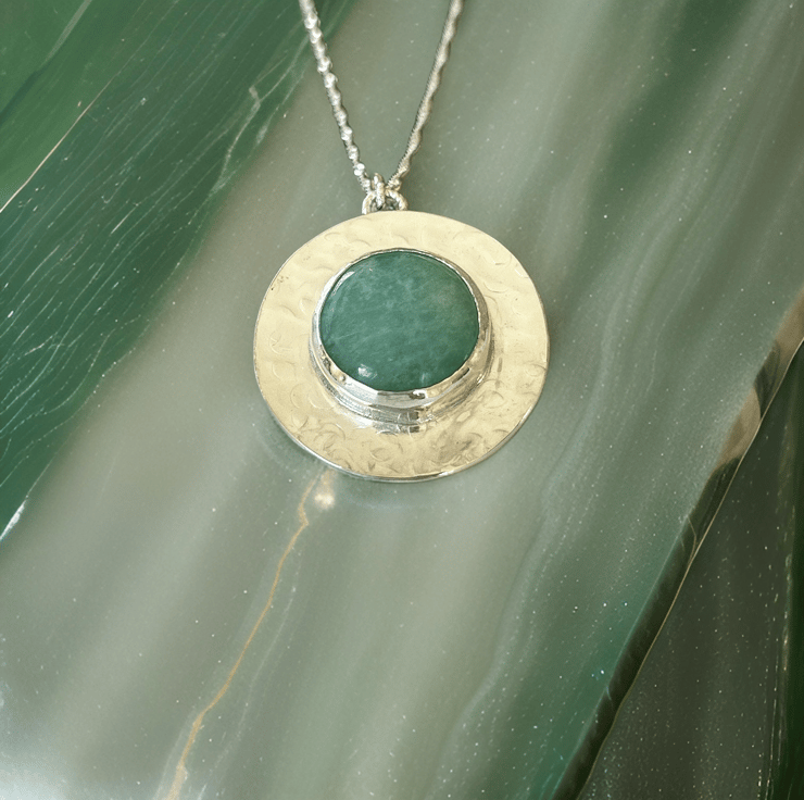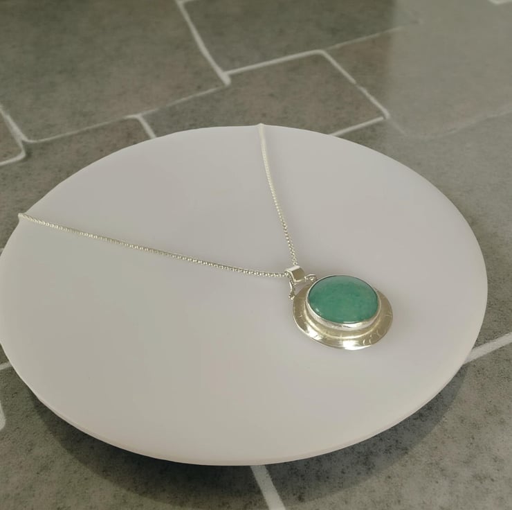 A gorgeous Amazonite necklace. This design features a 18mm natural Amazonite gemstone set in sterling silver, with a hand-cut hammered halo pendant measuring 30mm. The is finished with a sterling silver chain, alternate lengths are available.