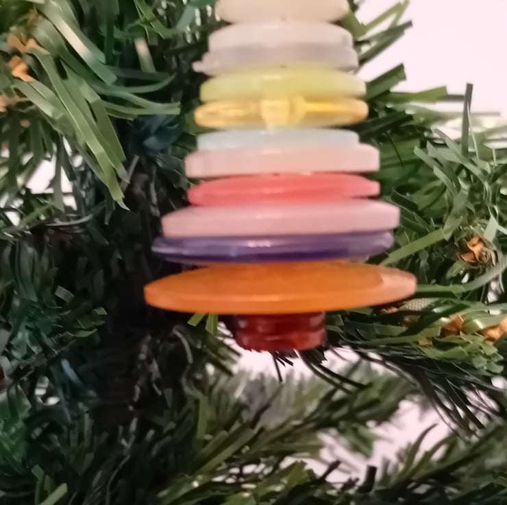 The buttons are strung securely on wire, topped with a shiny button, and finished with a loop so it’s ready to hang on your Christmas tree. No two are exactly the same every tree has its own character, making it a one-of-a-kind decoration or a lovely little gift.