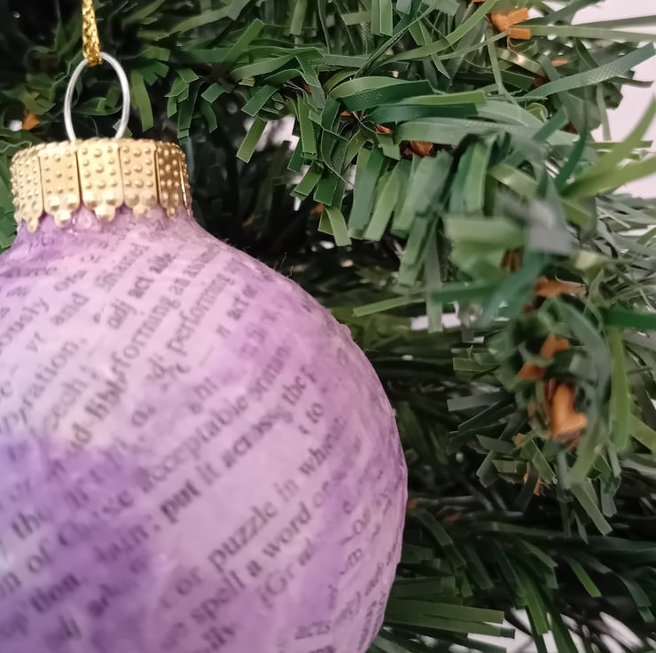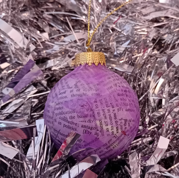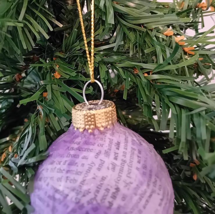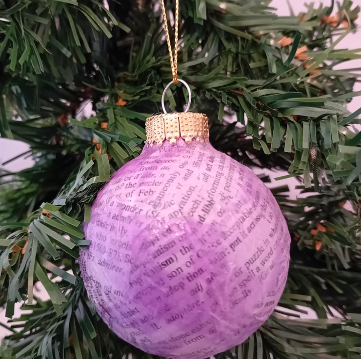 This charming bauble has been given a second life from a charity shop find! First covered in upcycled book paper, it’s then layered with colourful tissue paper for a cheerful, festive look. Finished with a gold cord, it’s ready to hang and add a splash of handmade charm to your tree. Perfect for eco-conscious decorators or anyone who loves a unique, story-filled decoration!