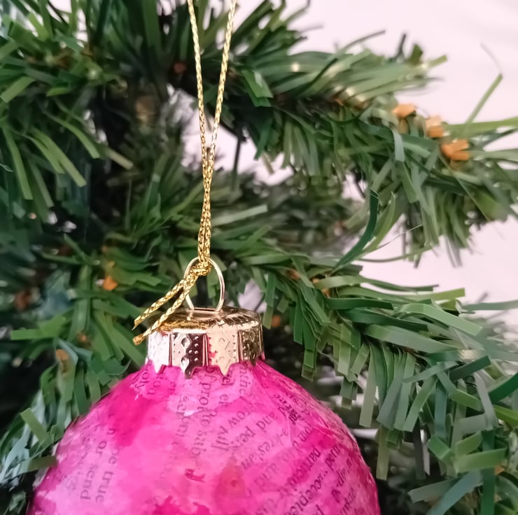 This charming bauble has been given a second life from a charity shop find! First covered in upcycled book paper, it’s then layered with colourful tissue paper for a cheerful, festive look. Finished with a gold cord, it’s ready to hang and add a splash of handmade charm to your tree. Perfect for eco-conscious decorators or anyone who loves a unique, story-filled decoration!