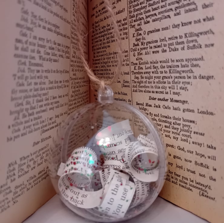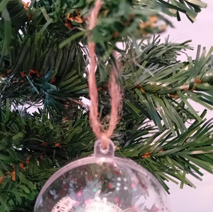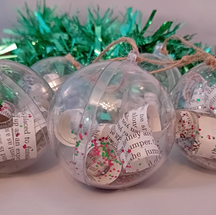 These lovely baubles have been upcycled using pages from a book that was beyond repair. Tiny strips of the pages have been curled and tucked inside clear plastic baubles, with a sprinkle of glitter to make them shimmer and shine on your tree.