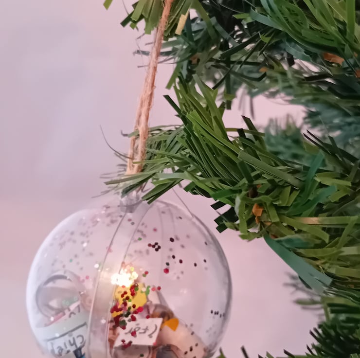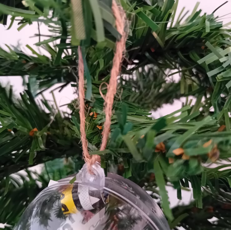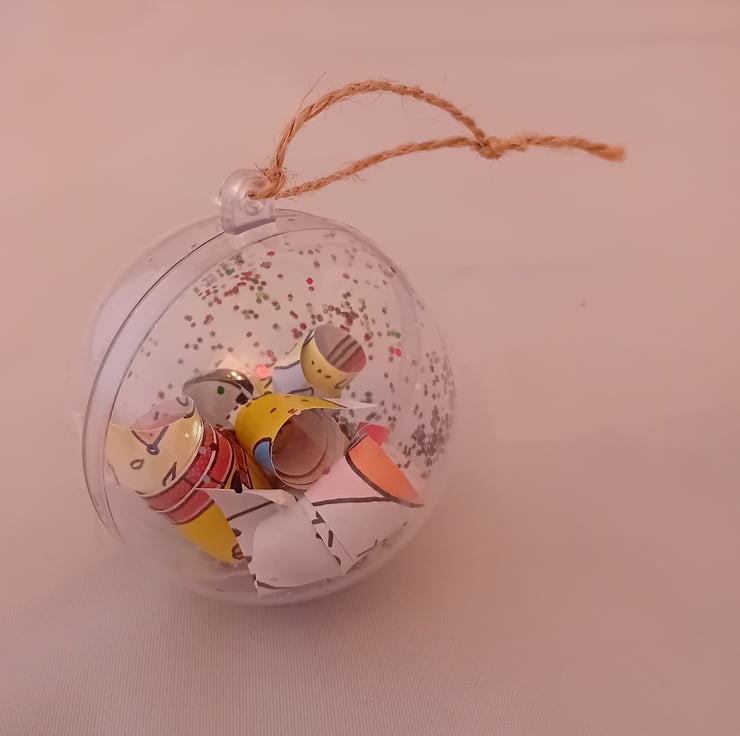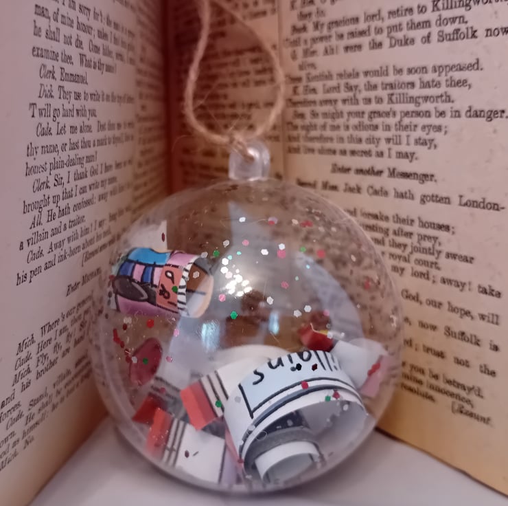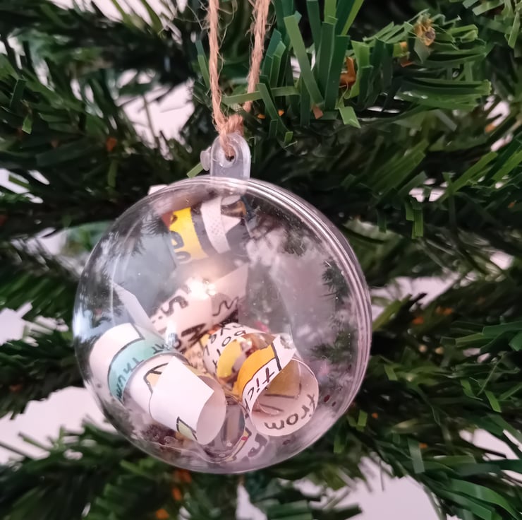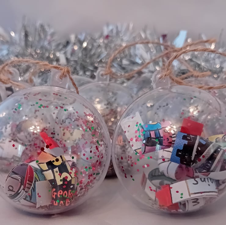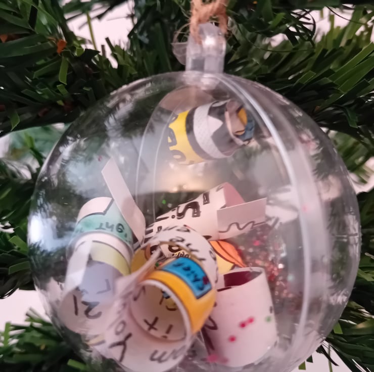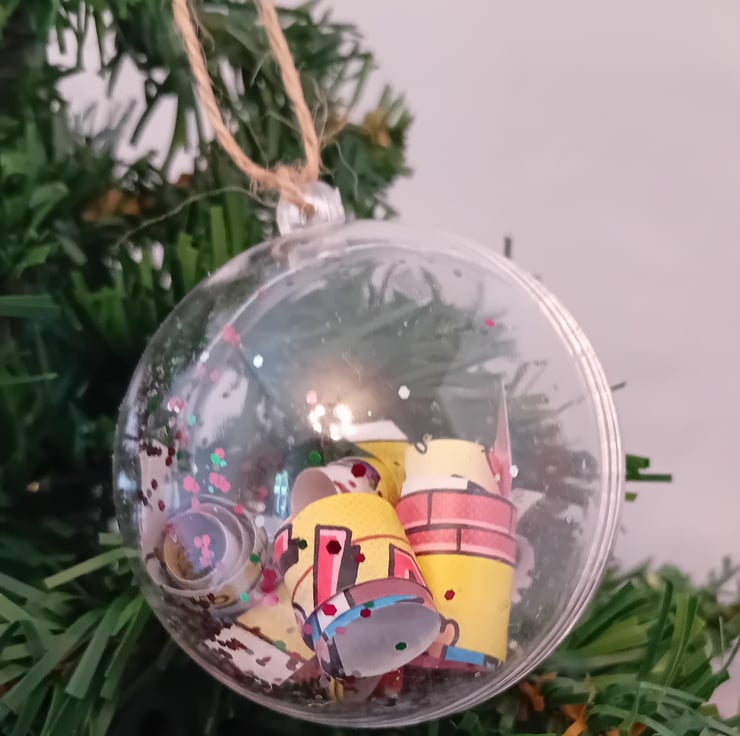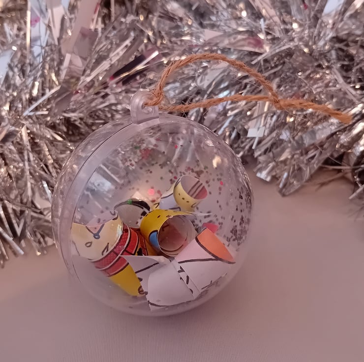 These lovely baubles have been upcycled using pages from a graphic novel that was beyond repair. Tiny strips of the pages have been curled and tucked inside clear plastic baubles, with a sprinkle of glitter to make them shimmer and shine on your tree.