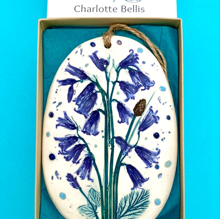 An attractive porcelain plaque decorated with delicate pressings of Clychau’r Gog (Bluebells) capturing the movement and finest details of the elegant flowers. One of my favourite to see on woodland walks.