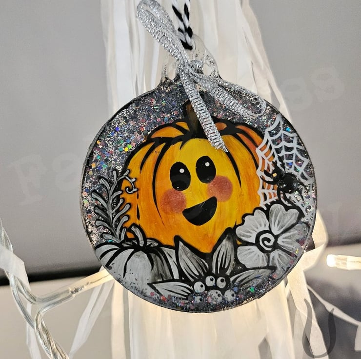 I love Halloween, especially pumpkins. This little chap was launched on a glass design last year and when I started dabbling with resin earlier this year he was the obvious choice for a 'flat' FabUbauble. I deliberately kept the rest of the painted detail in monochrome so that his yummy orange really stands out <3