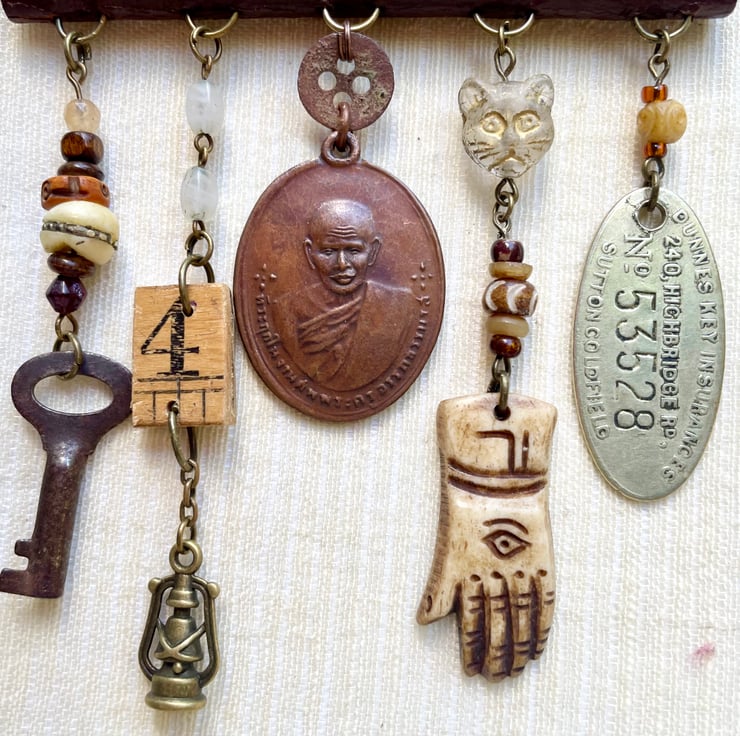 I matched the small wallet pendant with other vintage unique materials found mostly in charity shops, which I collected over the years: beads from vintage necklaces, carved bone beads, vintage aged key and key reward tag, vintage Thai medal and rosary bead, tribal beads. On the brown cotton fabric cord I stitched small crocheted circles which match the pattern of the carved bone beads.
