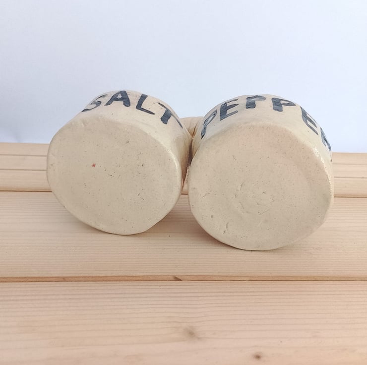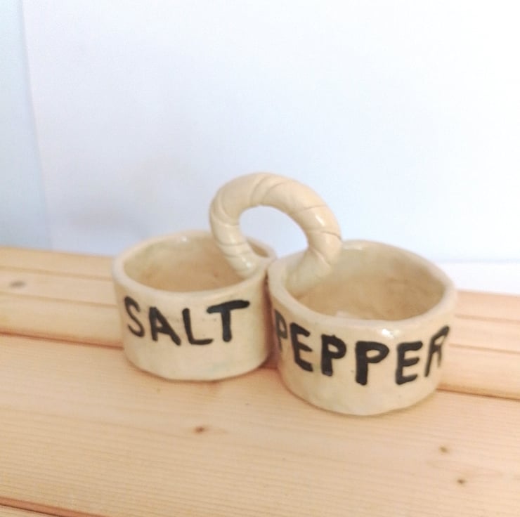 A unique hand made ceramic white salt and pepper holder with handle. Suits table setting, Made from white high quality stoneware clay, and finished with a glossy glaze, to retain the natural ivory white color of the fired clay. The handle is decorated with a spiral and there is hand written black script on the front of the pots, saying SALT PEPPER. in large case. Stands with handle 8 cms, or pots stand 4 cms x 6 cms wide diameter.