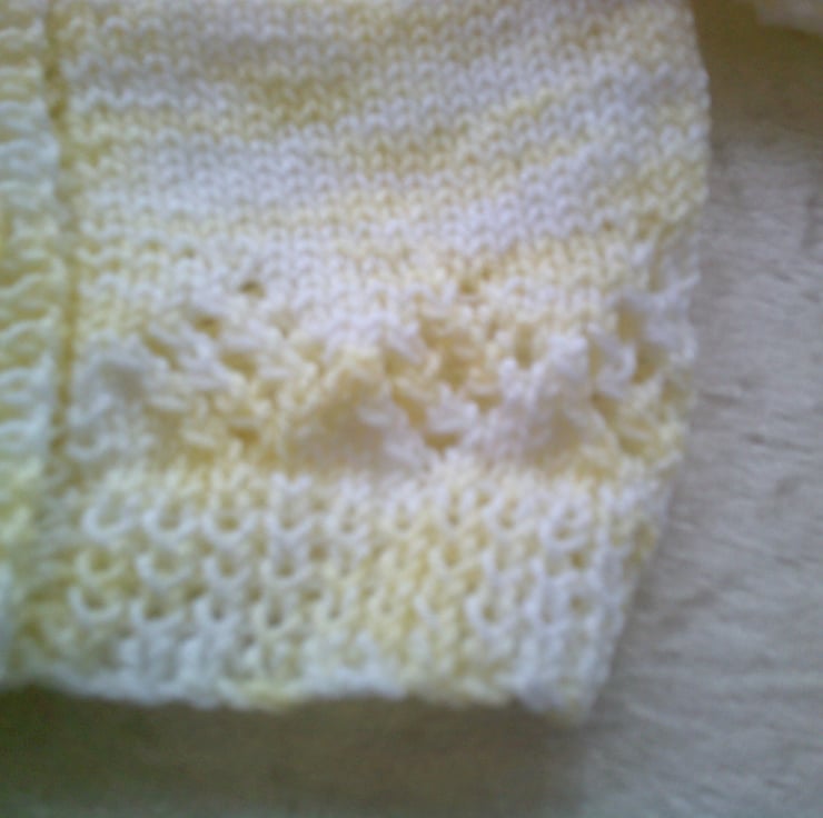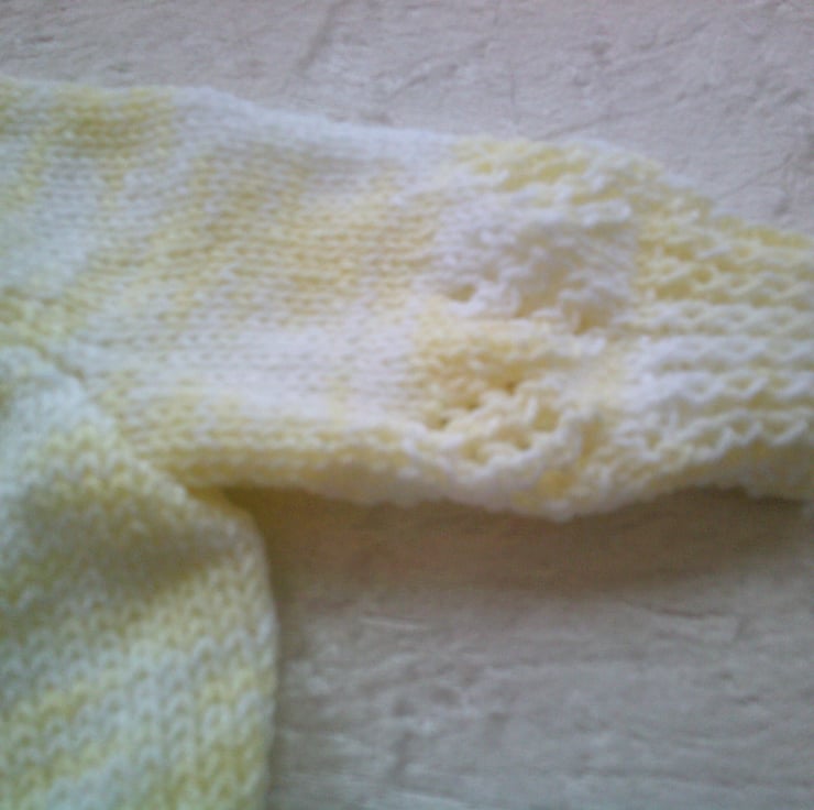 This hand knitted V Neck lemon and white random yarn cardigan has a lace detail just above the ribbing and raglan sleeves.