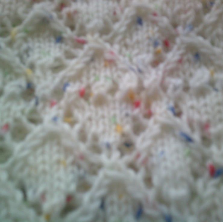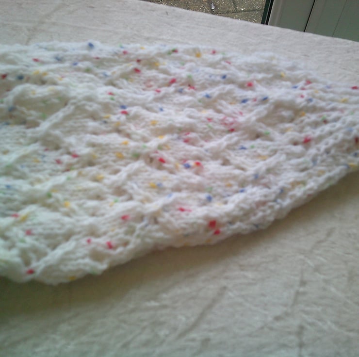 This hand knitted V Neck cardigan is made using white acrylic yarn with primary coloured flecks in blue, yellow, red and green. The cardigan has an overall lacy design. It would make an ideal addition to a little girls wardrobe as it can be used over a T shirt with Jeans, trousers or skirt.
