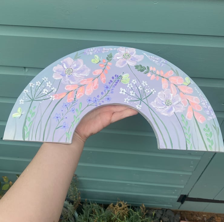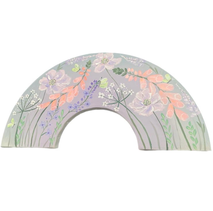 Hand Painted Floral Original art canvas on a rainbow arch shape approx 16” Canvas is flat on the back so could display on a shelf