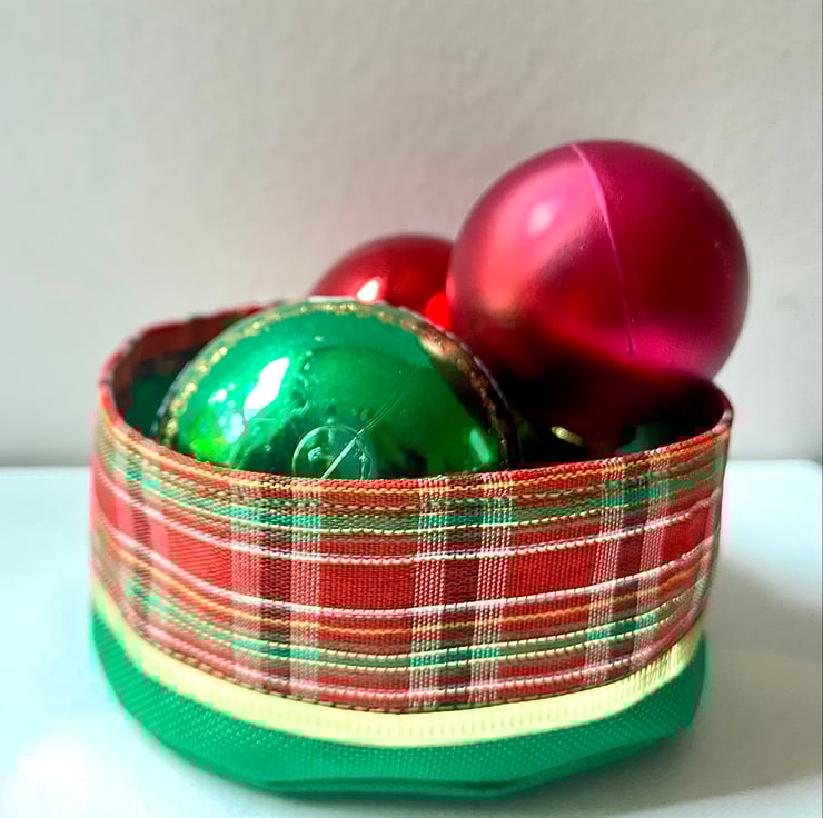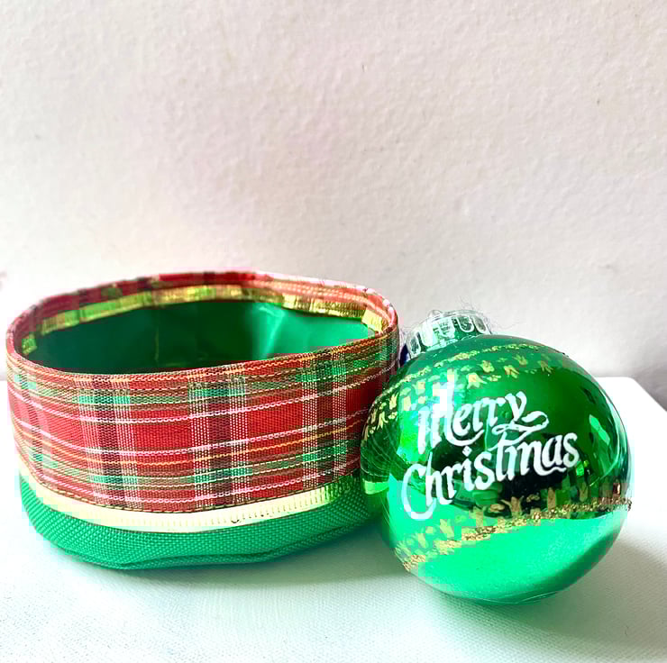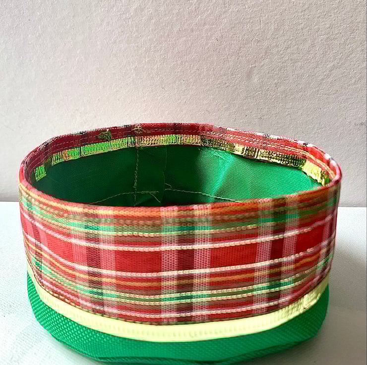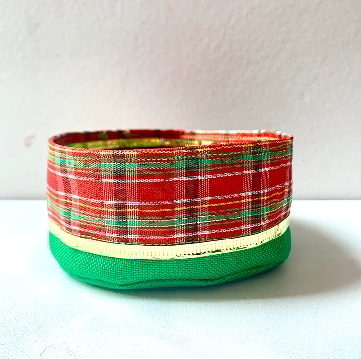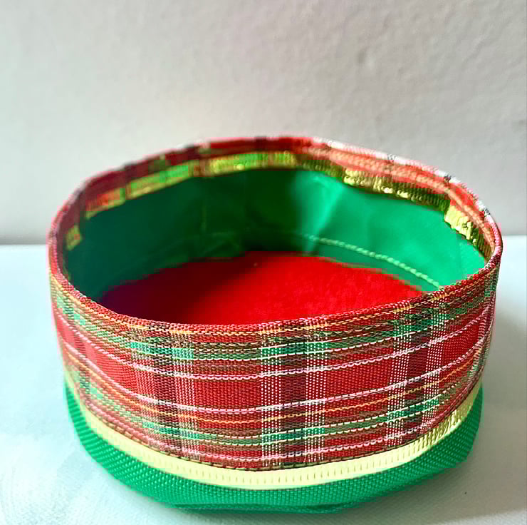 How about this? Hand made from water proof canvas fabric, which was left over from making garden furniture covers. Trimmed with tartan ribbon. It has a card and felt inner bottom. Very practical and seasonal.