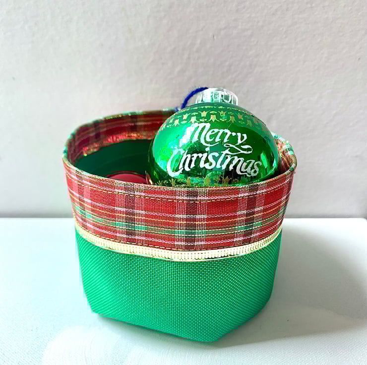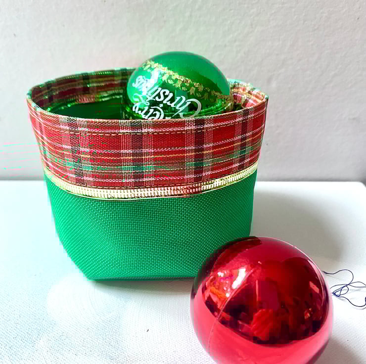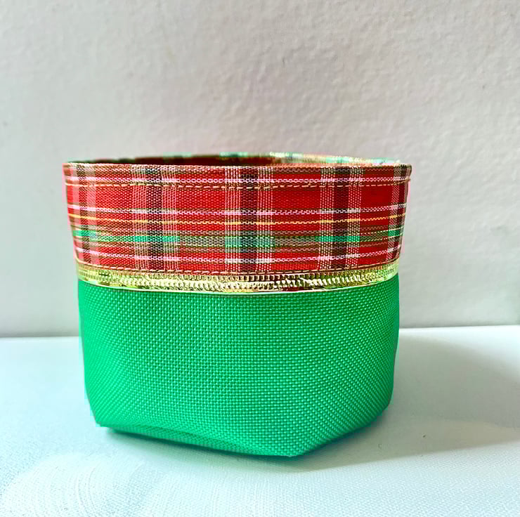 How about this? Hand made from water proof canvas fabric, which was left over from making garden furniture covers. Trimmed with tartan ribbon. It has a card and felt inner bottom. Very practical and seasonal.