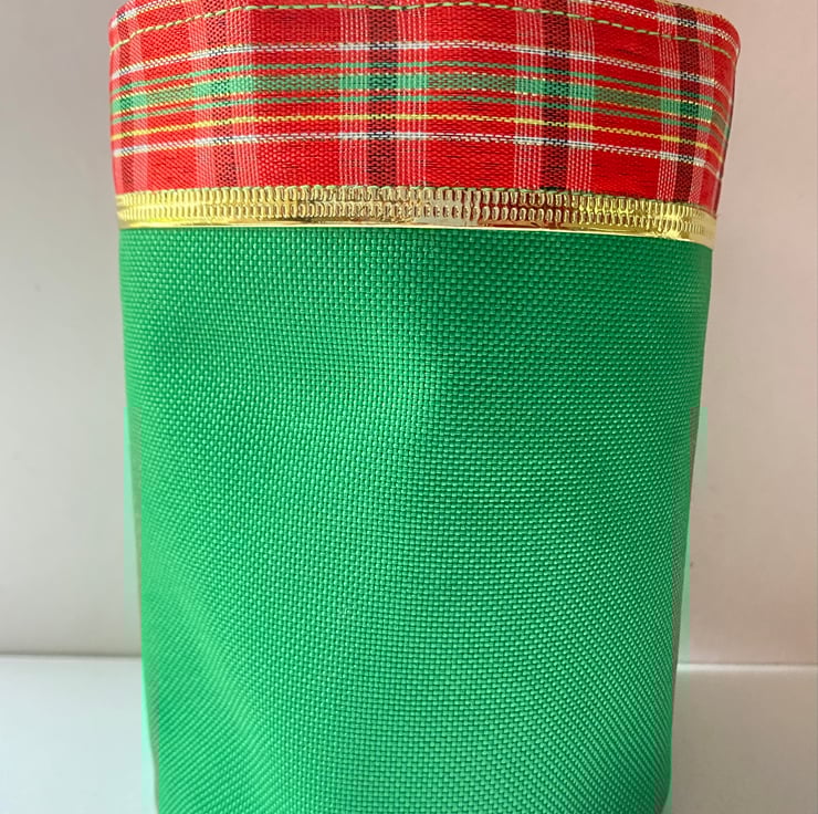 Hand made from water proof canvas fabric, which was left over from making garden furniture covers. Trimmed with tartan ribbon. It has a card and felt inner bottom. Very practical and seasonal.