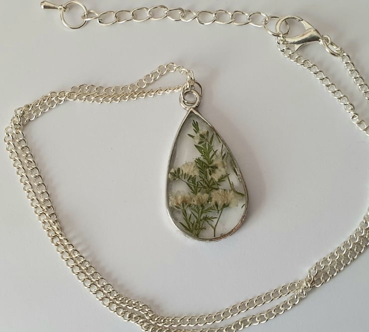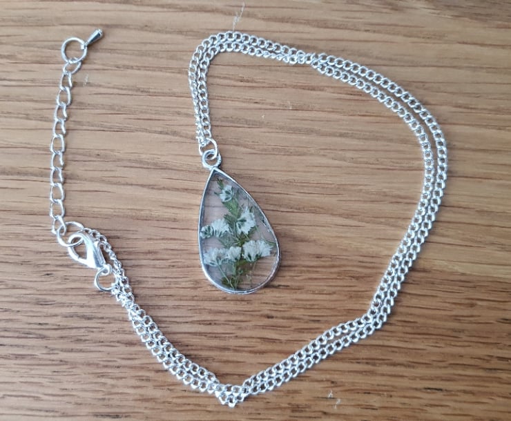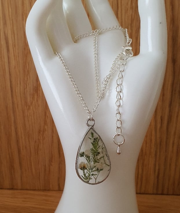 These real dried flowers have been set into resin within a frame. The chain is 18" in diameter and is silver plated with an extender chain and drop bead.