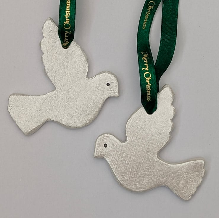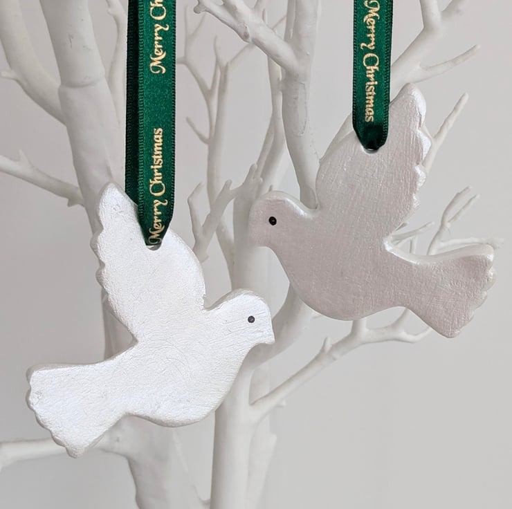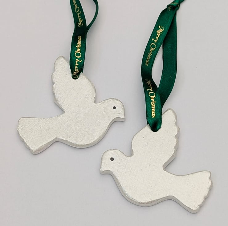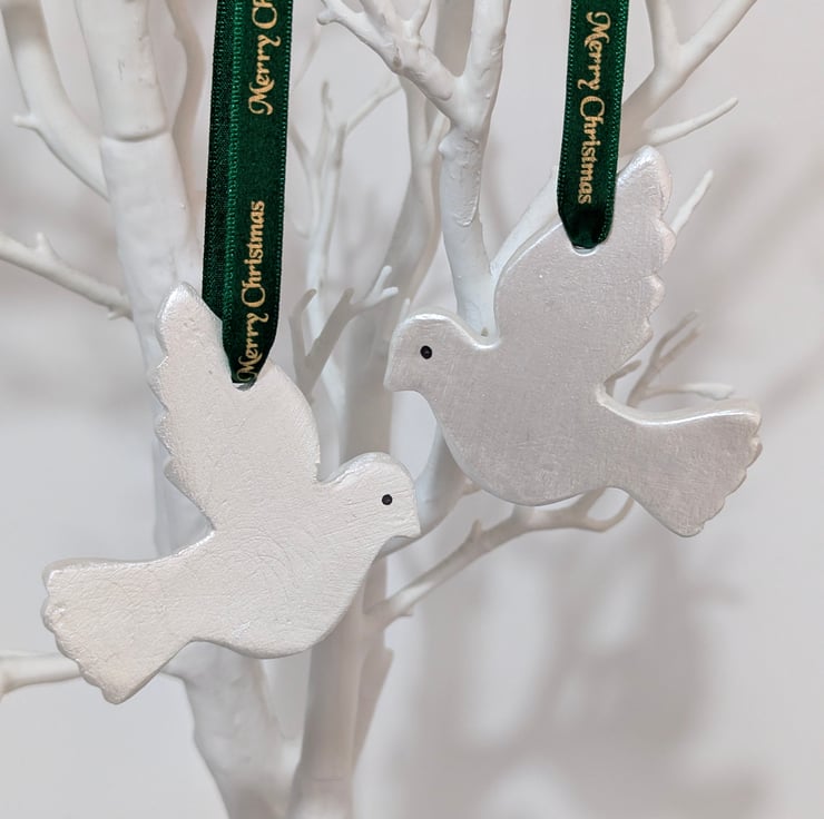 Pair of white doves lovingly handcrafted from air dry clay, lightly sanded and hand painted with white metallic acrylic paint for a slight shimmer to catch the light. The doves have been finished with dark green satin ribbon with Merry Christmas repeated in gold writing.