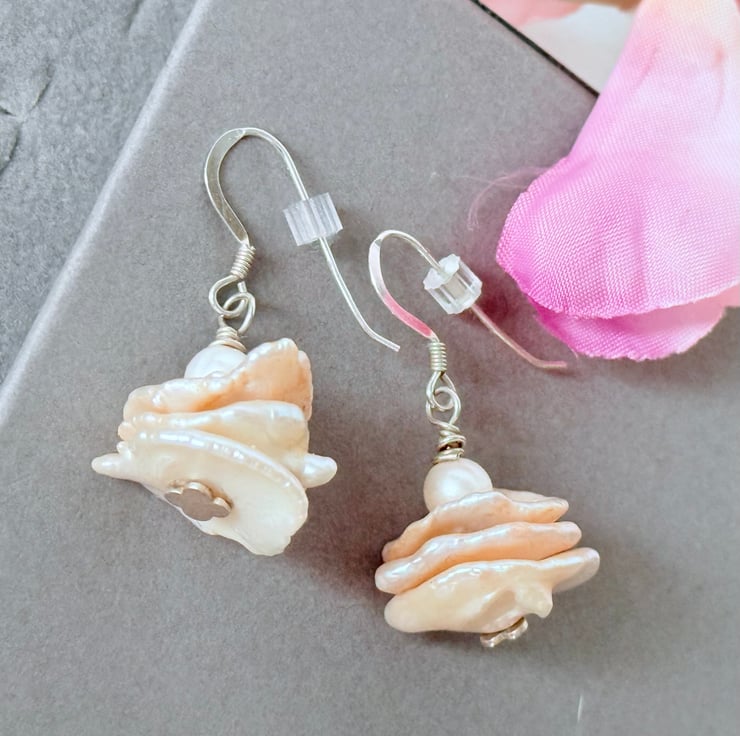 Freshwater Cultured Keshi Pearl Cluster Earrings with a near round pearl on the top. Sterling silver pins and hooks.