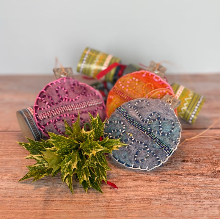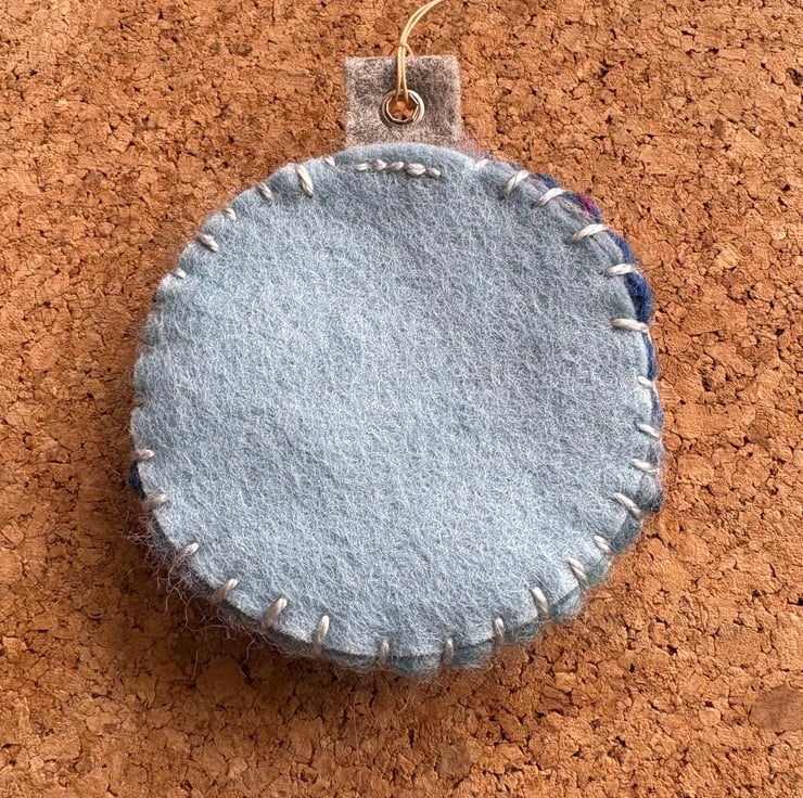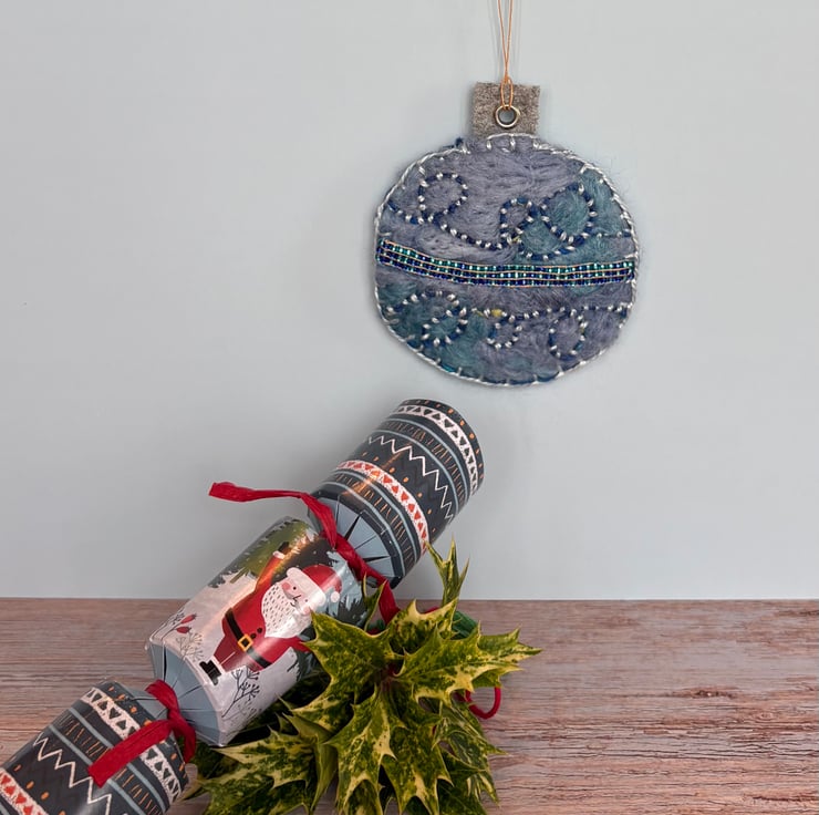 This hanging bauble Christmas decoration is created from a needle felted and embroidered piece embellished with woven beads and is strung on a waxed thread. It has a plain felt back.