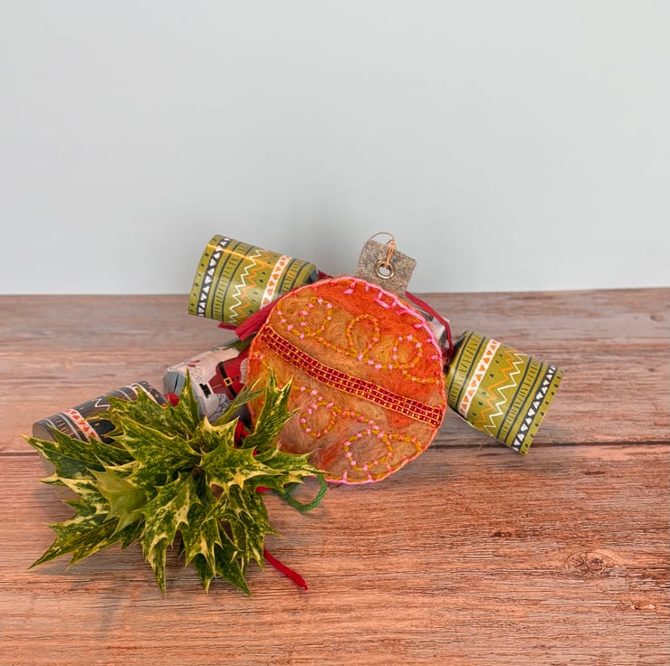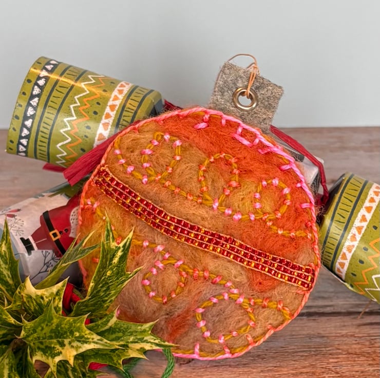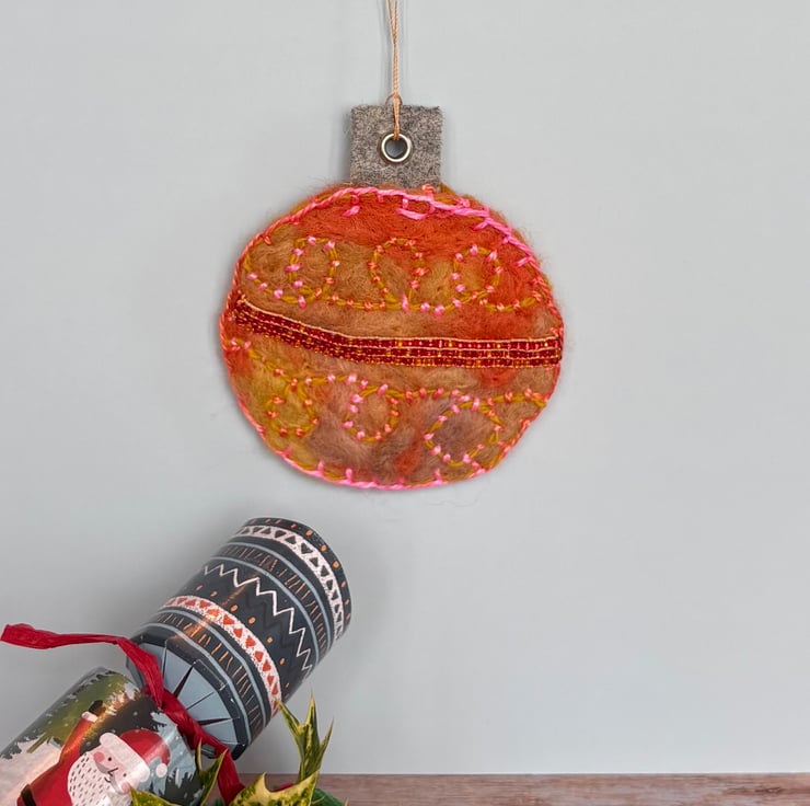 This hanging bauble Christmas decoration is created from a needle felted and embroidered piece embellished with woven beads and is strung on a waxed thread. It has a plain felt back.