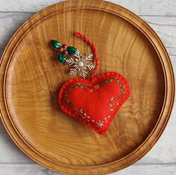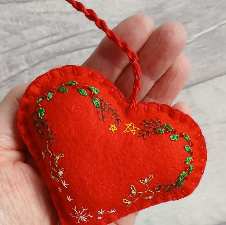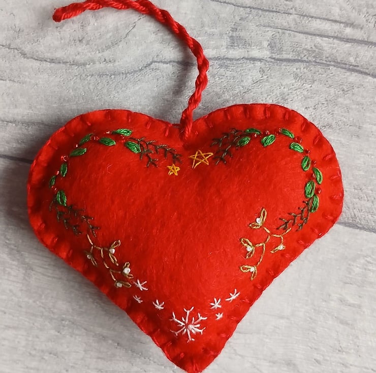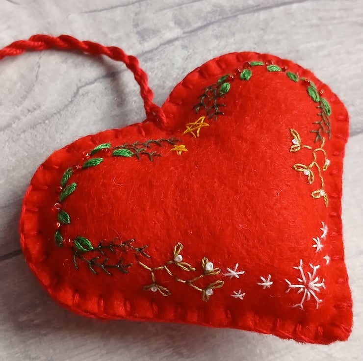 A one-of-a-kind, heart-shaped, Christmas tree decoration made from festive red wool felt. I've hand embroidered it with holly, pine, mistletoe, snowflakes and stars, and added tiny glass bead holly berries. Lightly stuffed, and finished with matching blanket stitch and a twisted thread hanging loop, this would make a special addition to any tree, or a lovely gift.