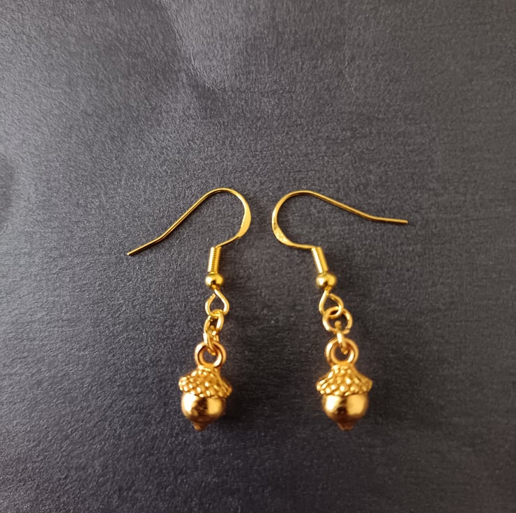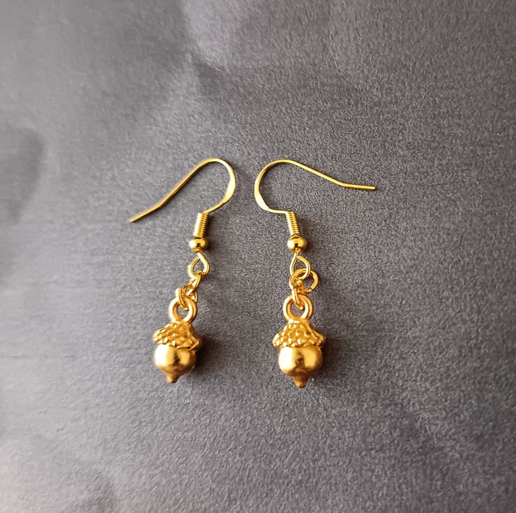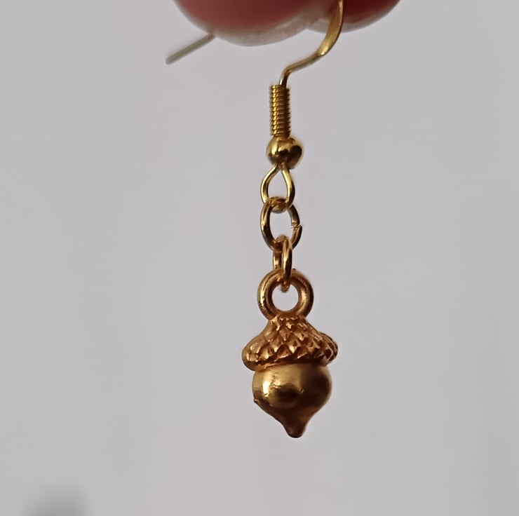 These handmade earrings are crafted from small gold stainless steel acorn charms and gold stainless steel earring hooks. Versatile in style, can be boho, seasonal or cottage-core but very much nature-inspired.