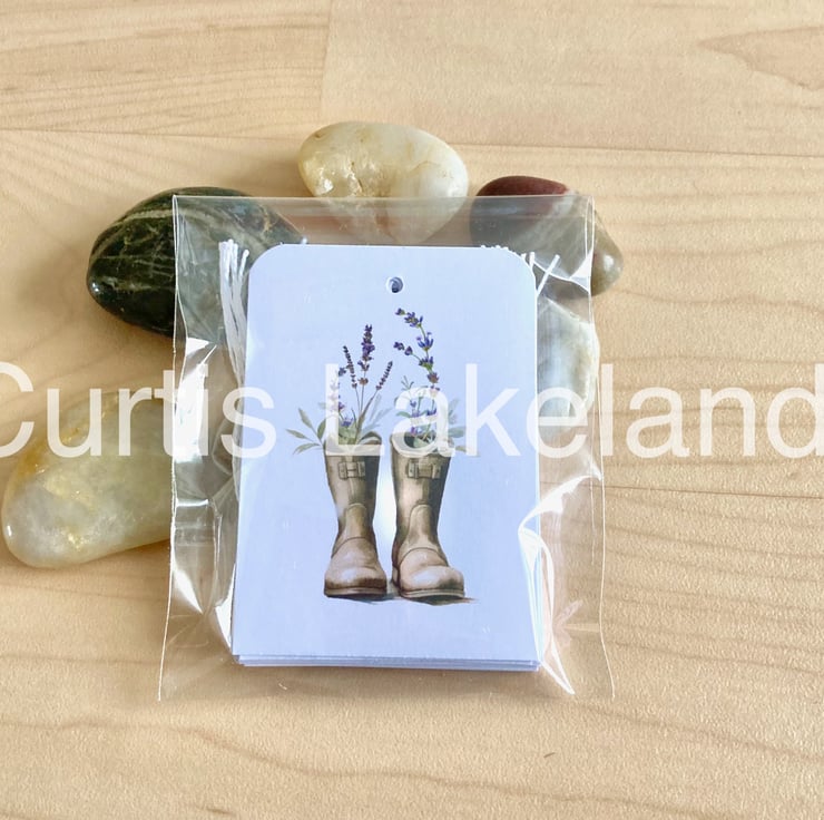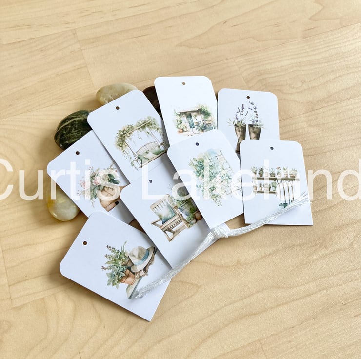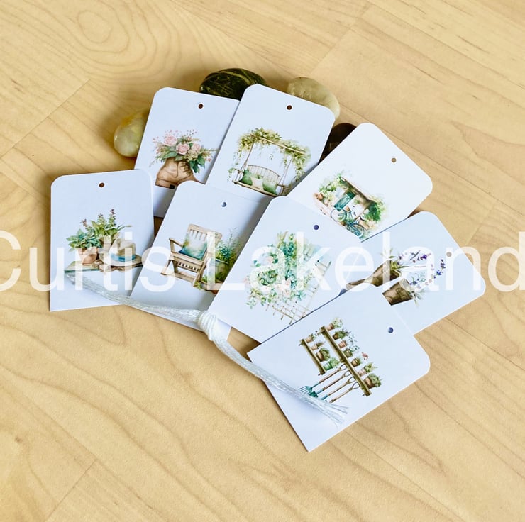 Collection of 16 Rustic Garden design gift tags with strings.