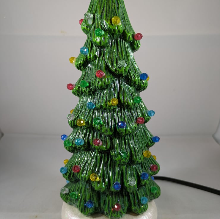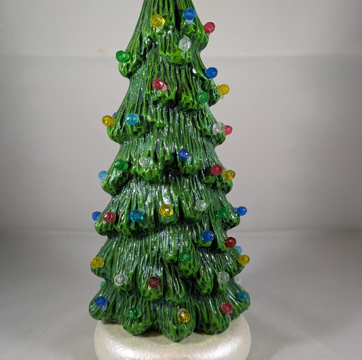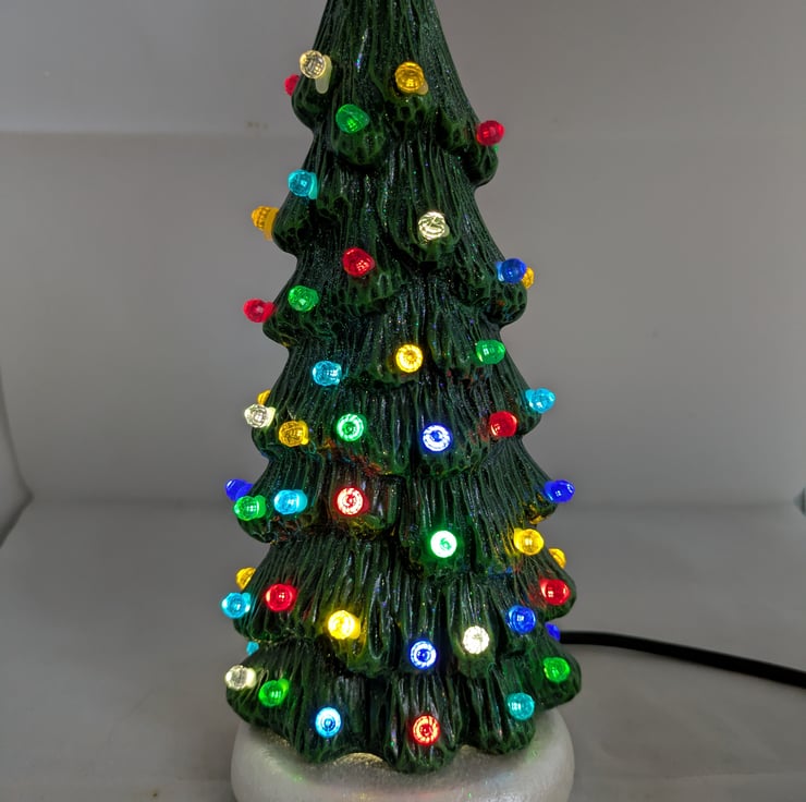 I have for sale a ceramic Christmas table lamp, which was hand painted by myself. It is a green glittery, slim style Christmas tree, which contains numerous small lights, in a variety of different colours. It stands on a white glittery small base, which is completely separate and contains the electrics. Included in the sale is a free G9 LED bulb. PLEASE NOTE: the plug will be removed, when packaging it up. This would make a lovely addition to anyone's Christmas decorations, or perhaps given as a gift.