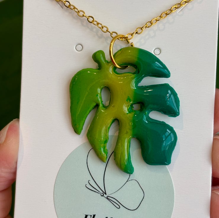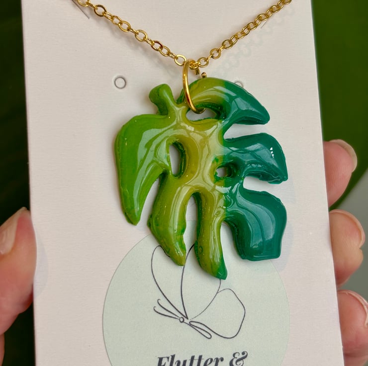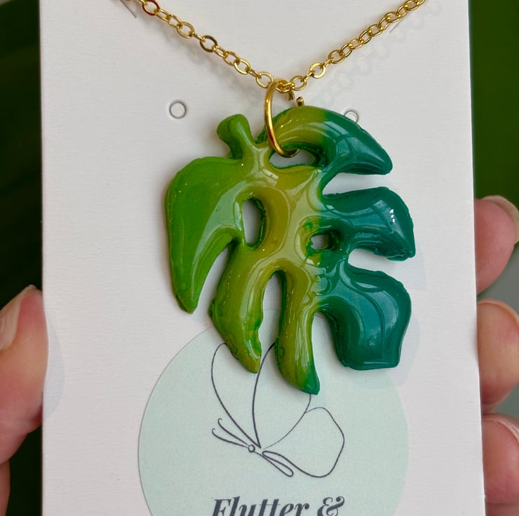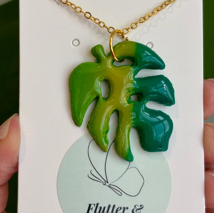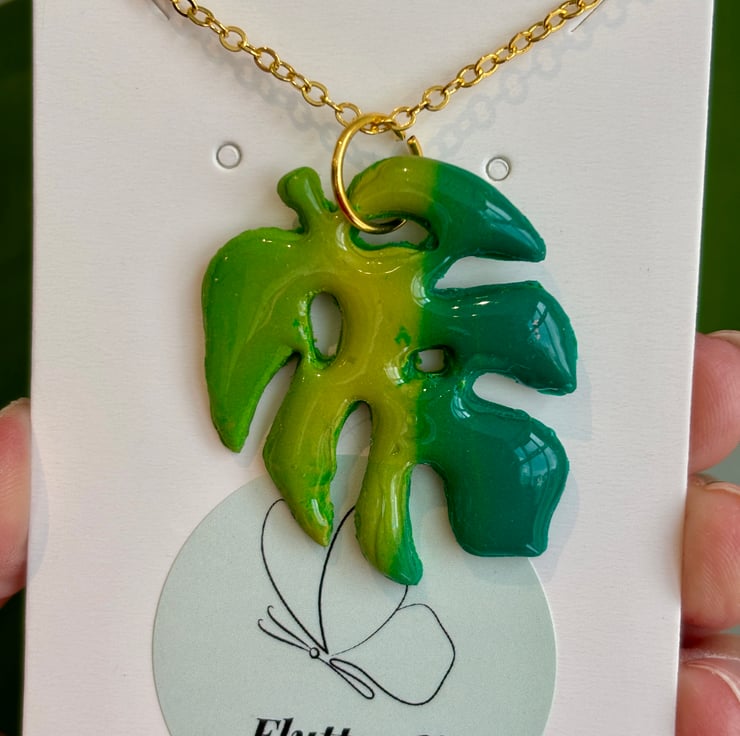 A tribute to nature’s quiet strength. This handmade Monstera leaf pendant glows with a gradient of green—from soft spring hues to deep forest tones—capturing the essence of growth, grounding, and renewal. Flecked with gold and finished in a glossy sheen, it’s suspended from a golden chain like sunlight filtering through leaves. A piece for plant lovers, wanderers, and those who find magic in the wild and the still.