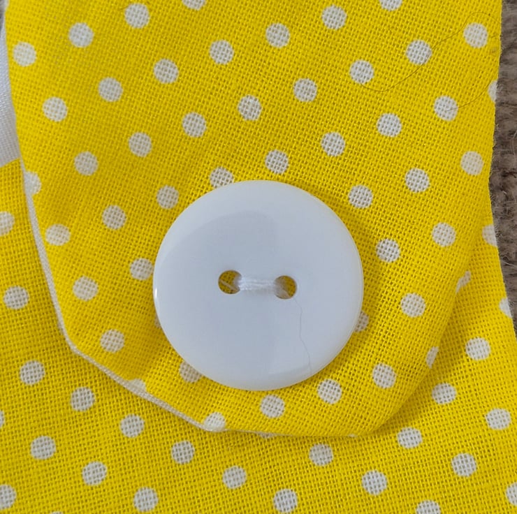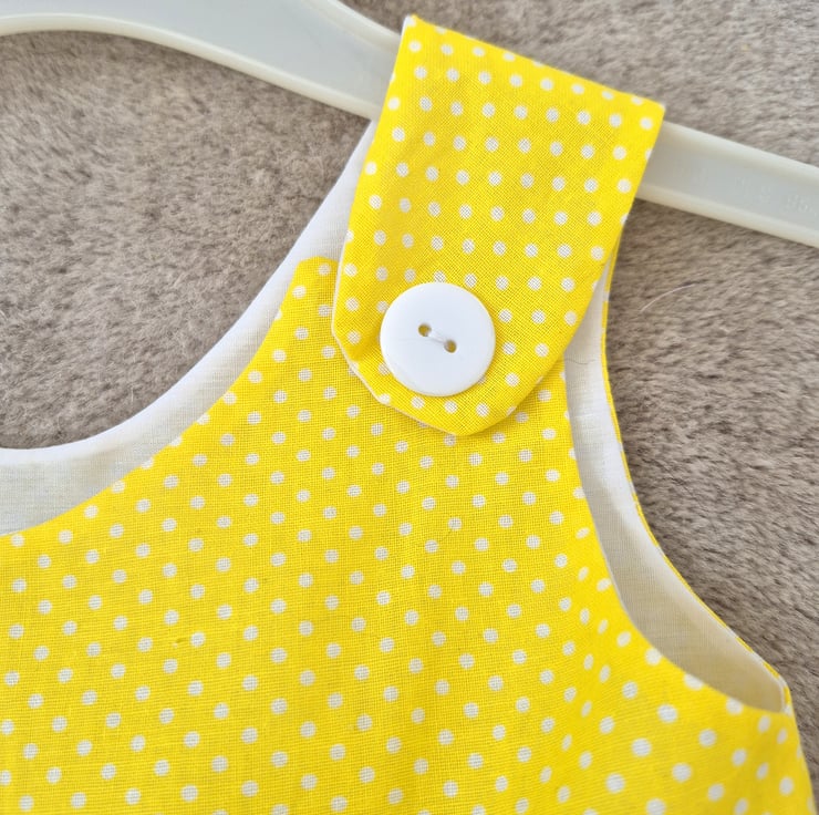 The dress has poppers on the shoulders making it easy to put on and take off and they are covered by contrasting white buttons