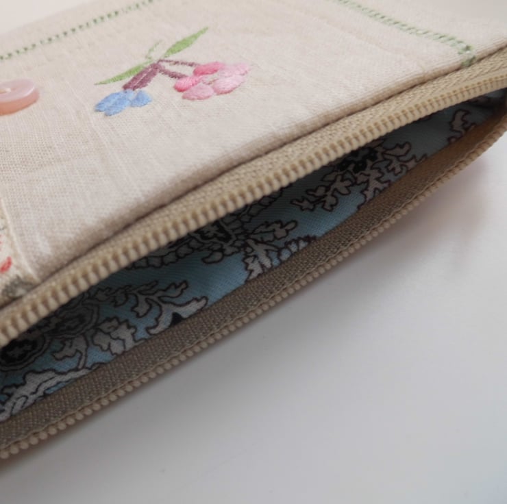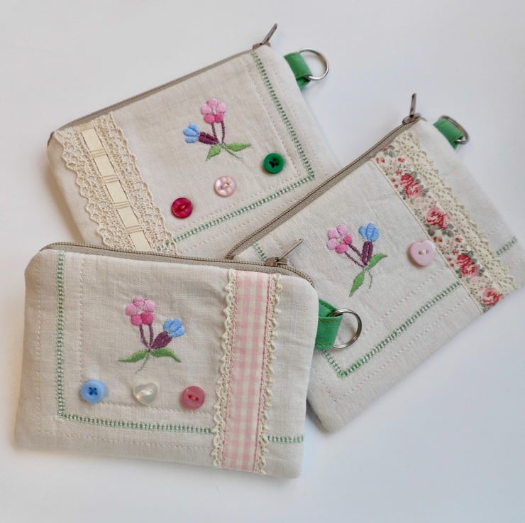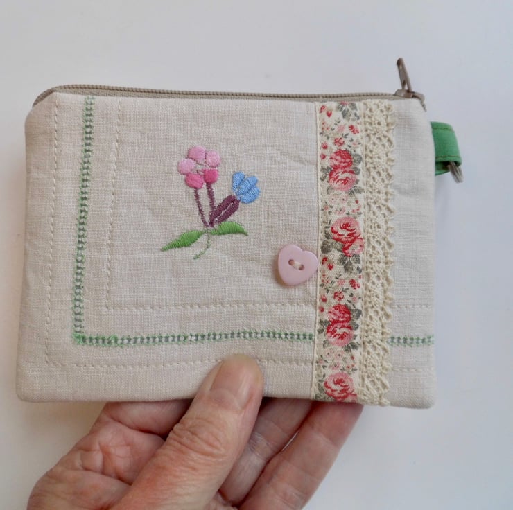 I made this coin purse using fabric salvaged from a vintage tray cloth which was no longer fit for purpose. I think the little posy is machine embroidered. I backed the fabric with fusible fleece for stability and extra body and embellished the front with extra stitching, a heart shaped button, rose printed ribbon and vintage style lace.