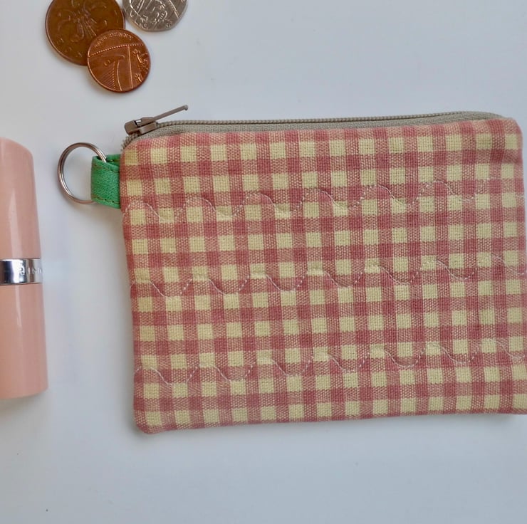 On the reverse is a pink printed check and there is a key ring inserted into one of the side seams.
