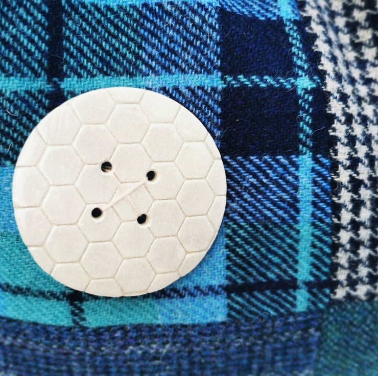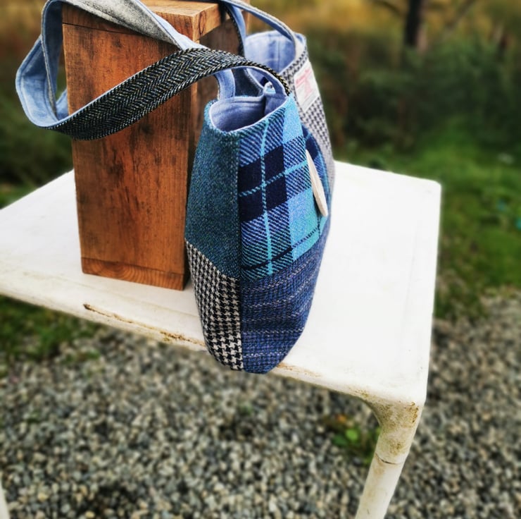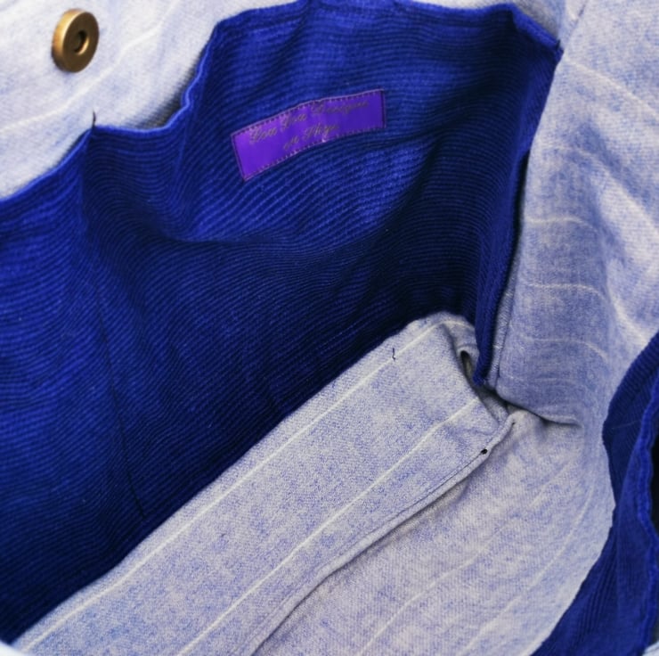 This is a large shopper patchwork bag with handmade bee hive button on it