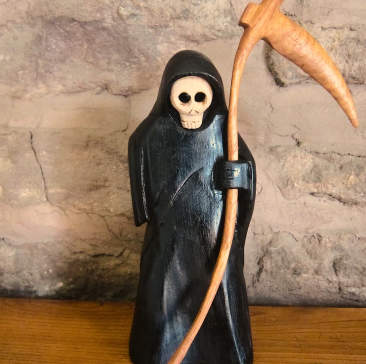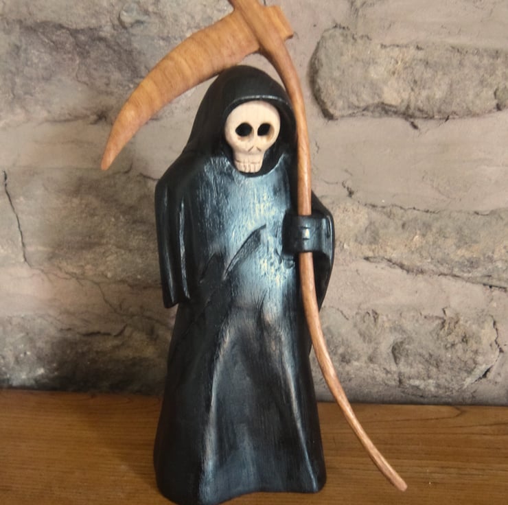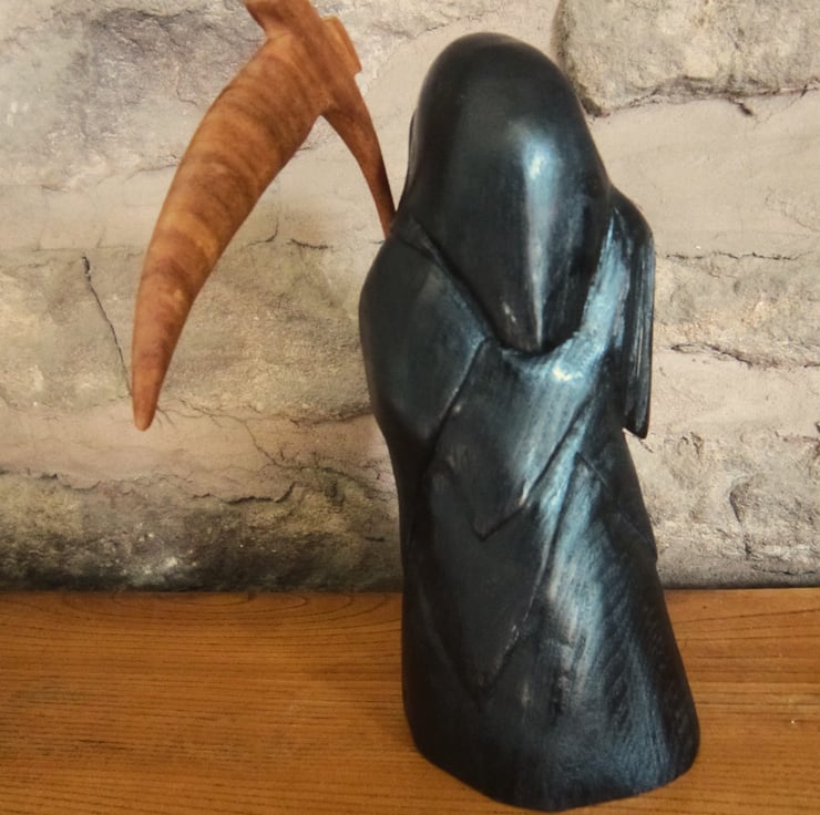 This grim reaper ( or DEATH ) is carved from inbuia walnut and stands 7 inches tall.