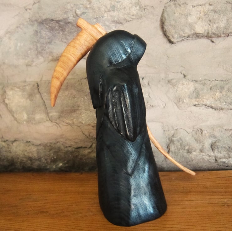 The skull is made from sycamore, the scythe from mahogany and the body is stained with ebony shellac polish and finished finally in a bees wax.