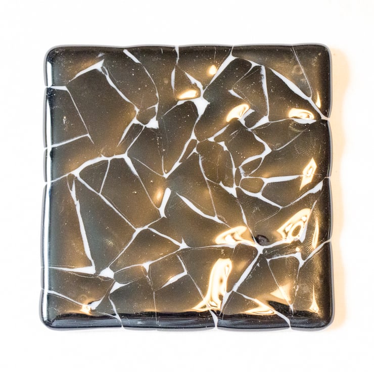 This 10cm square coaster started with a base of white glass. I then laid out small pieces of black glass on top, covering most of the base, but leaving narrow gaps between the pieces.