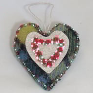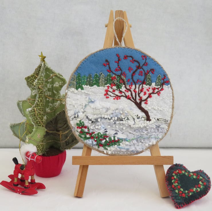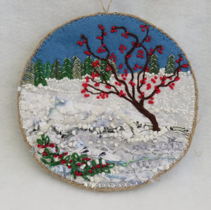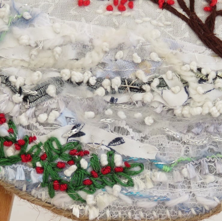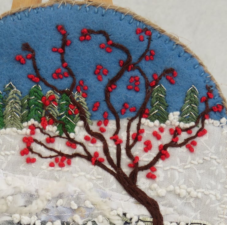 This hand embroiderd plaque features a rowan tree, festooned in bright red berries, beside a frozen pond. Most of the materials used are remnants, snippets from other projects, commercial remnants or carefully collected vintage supplies. I take care to sew as sustainably as possible!