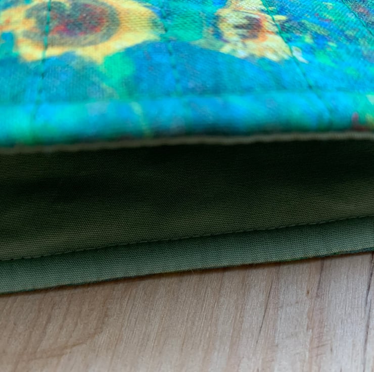 The sleeve is quilted with green colour stitching and is lined in sage green colour cotton.