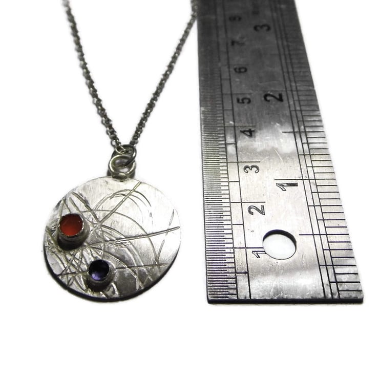 rose cut carnelian and iolite on roller printed sterling silver disc pendant