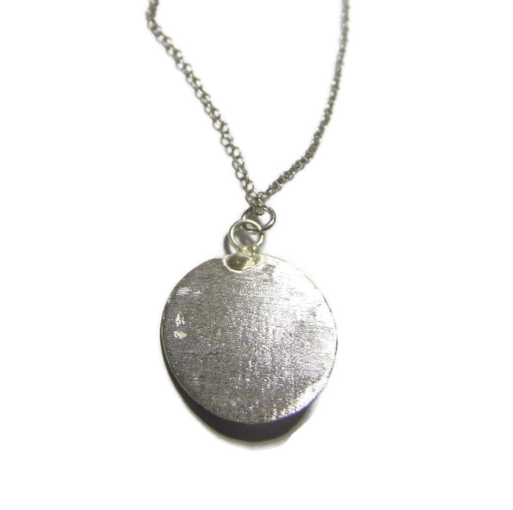 The disc measures 25mm in diameter and hangs from a 50 cm sterling silver chain which fastens with a bolt clasp