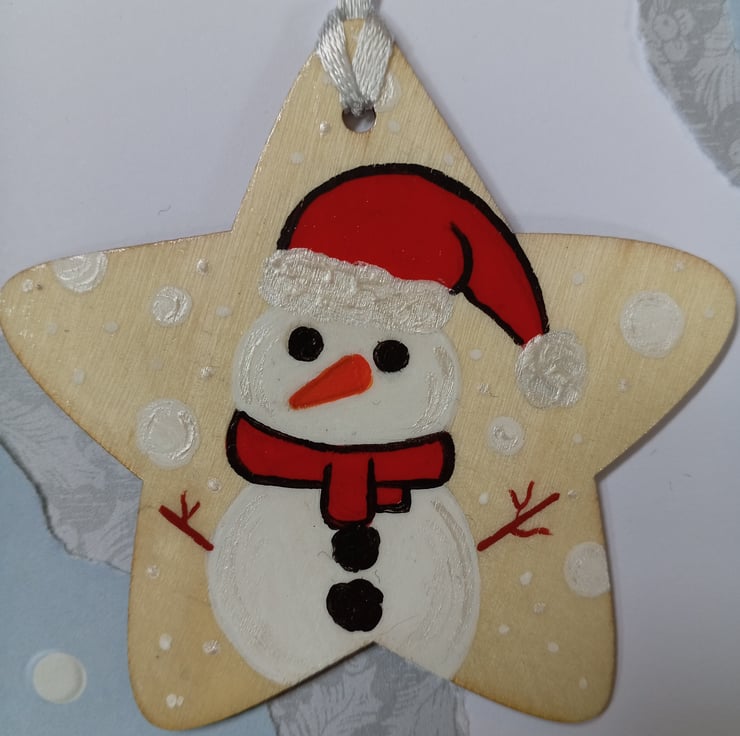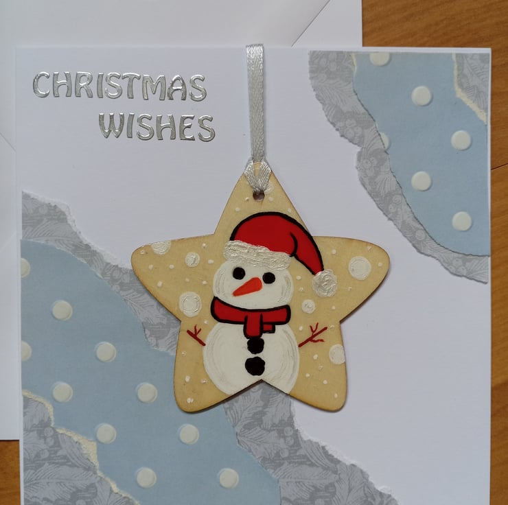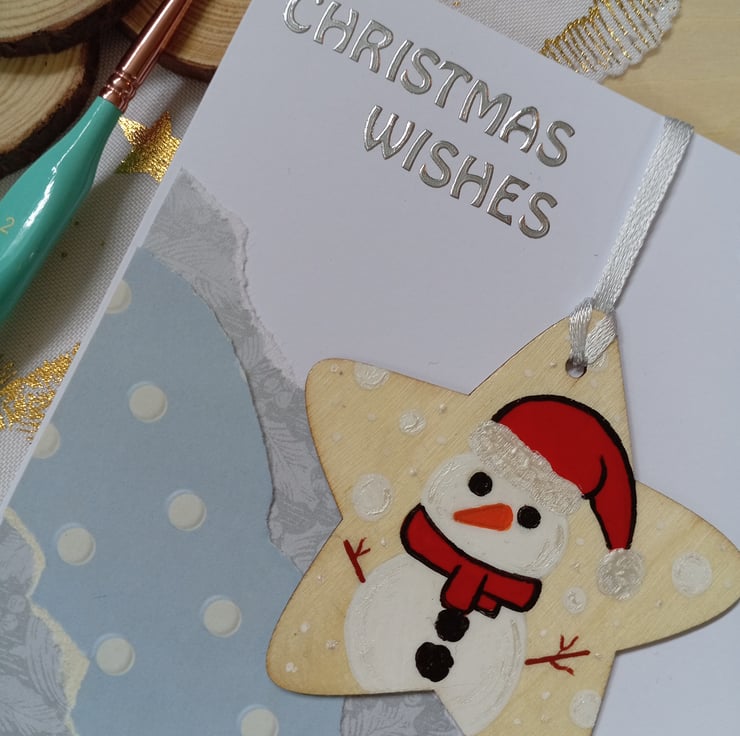 A hand made christmas card featuring a wooden star decoration that has been hand painted in a cute Christmas snowman design