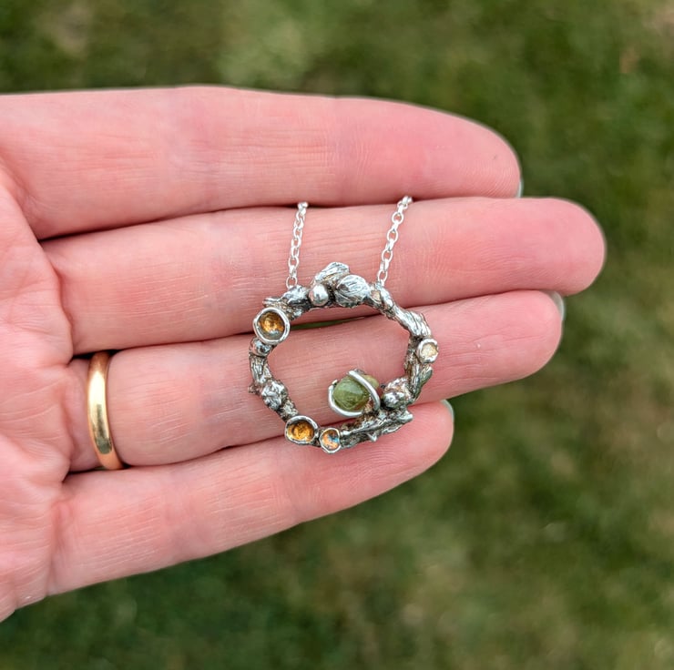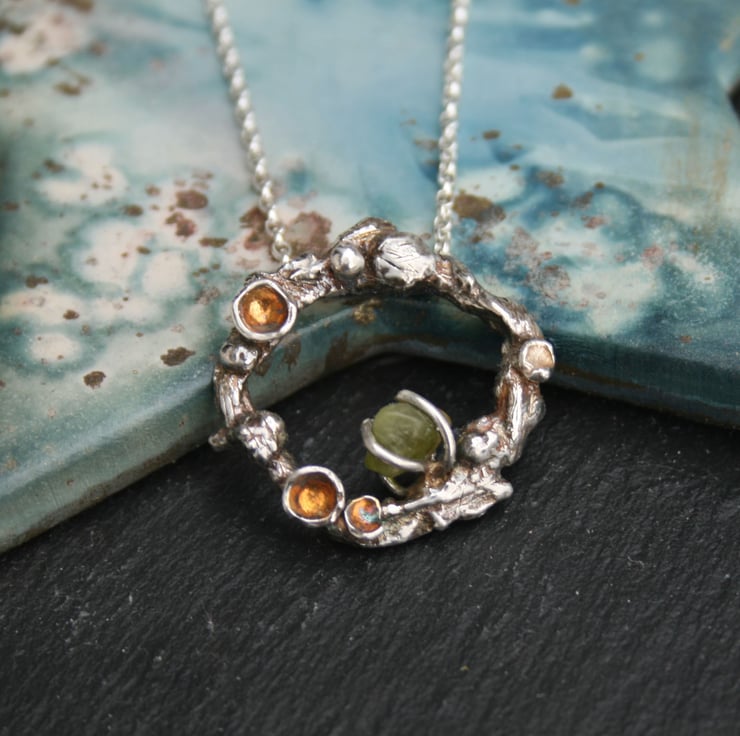 I created this silver lichen twig necklace by recycling sterling silver offcuts and shaping them into a round twig-like branch. Along the twig, I’ve added tiny lichen details and set a raw nugget of peridot securely in silver claws, so it nestles naturally within the design.