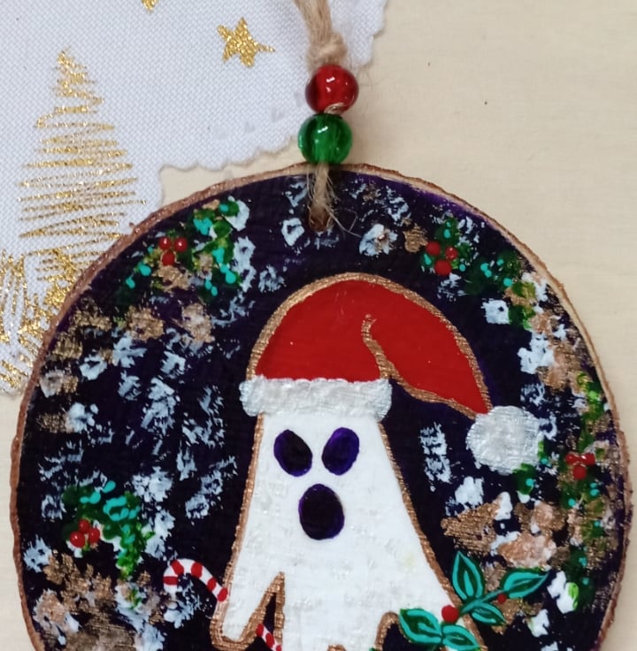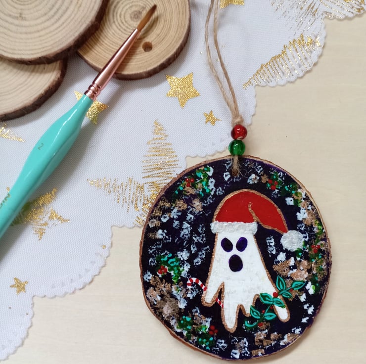 A 6cm woodslice that has been hand painted with a Christmas design featuring a ghost
