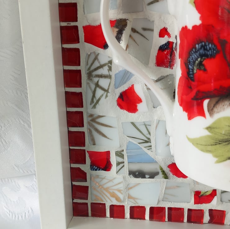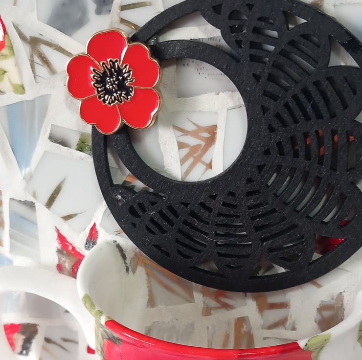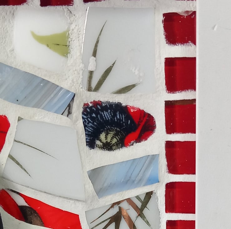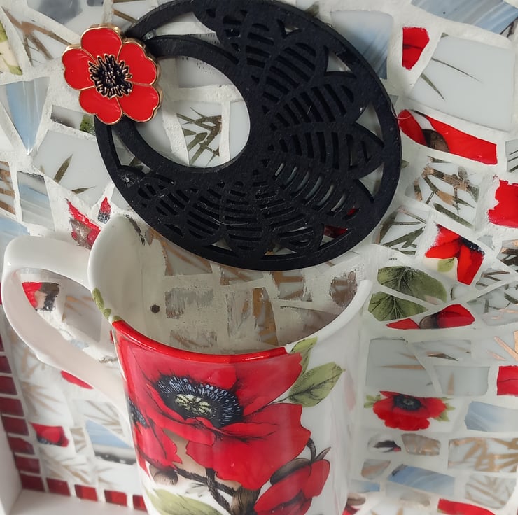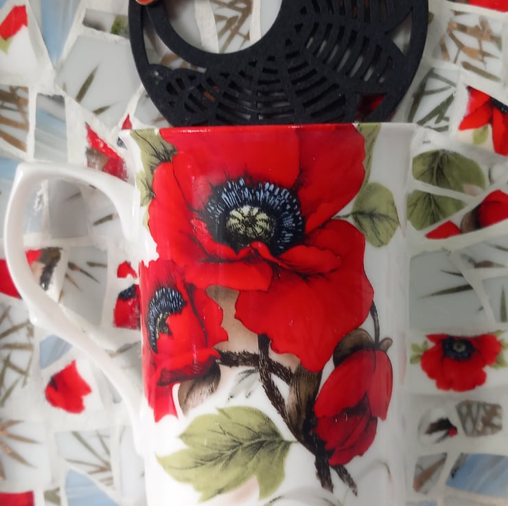 This mug has been transformed into a framed mosaic picture surrounded by mug fragments, and shards from another project, and embellished with a poppy pin badge set in a piece of reclaimed jewellery.