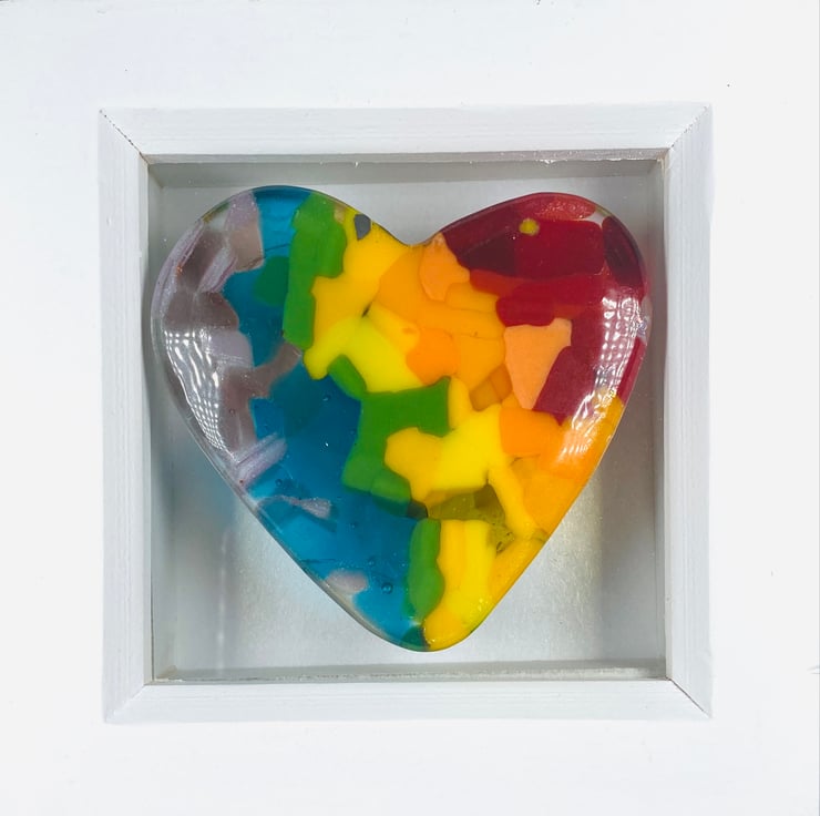 Gorgeous fused glass cast heart in a white box frame . Predominantly opaque glass with the odd hint of transparent glass to give added interest. The heart is joyful and full of colour and when sunlight catches it will cast rainbows in your room .. the picture is approximately 10 cm squared and can easily hang on the wall .