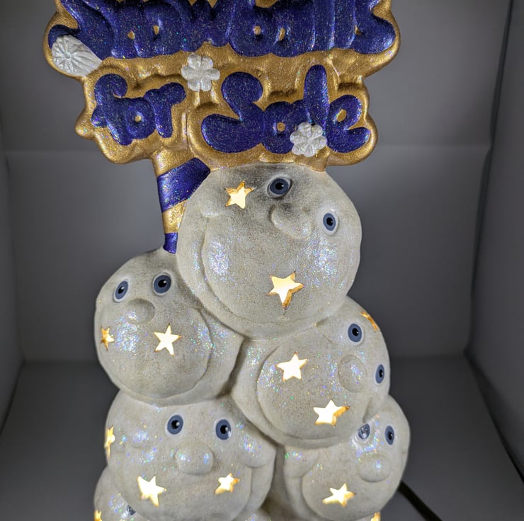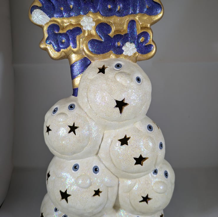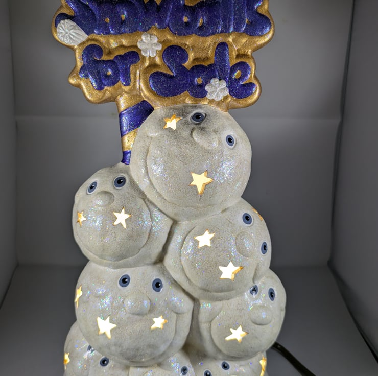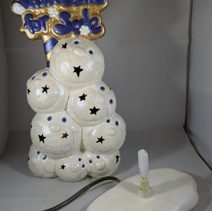 I have for sale a ceramic Christmas table lamp, which was hand painted by myself. It is a large pile of white glittery snowballs, with a sign above them 'Snowballs For Sale'. The sign is in a metallic blue and gold colours. The lamp has star shaped holes all over it, for the light to shine through them all, front and back. The snowballs stands on top of a white, glittery base, which is completely separate and contains the electrics. Included in the sale is a free G9 LED bulb. PLEASE NOTE: the plug will be removed, when packaging it up. This would make a lovely addition to anyone's Christmas decorations, or perhaps given as a gift.