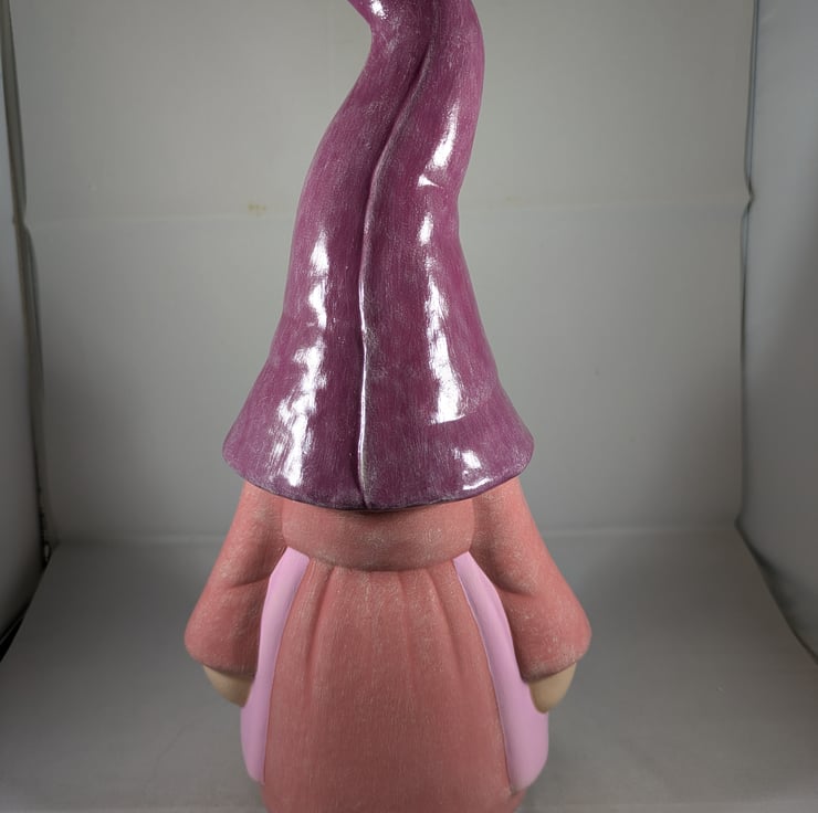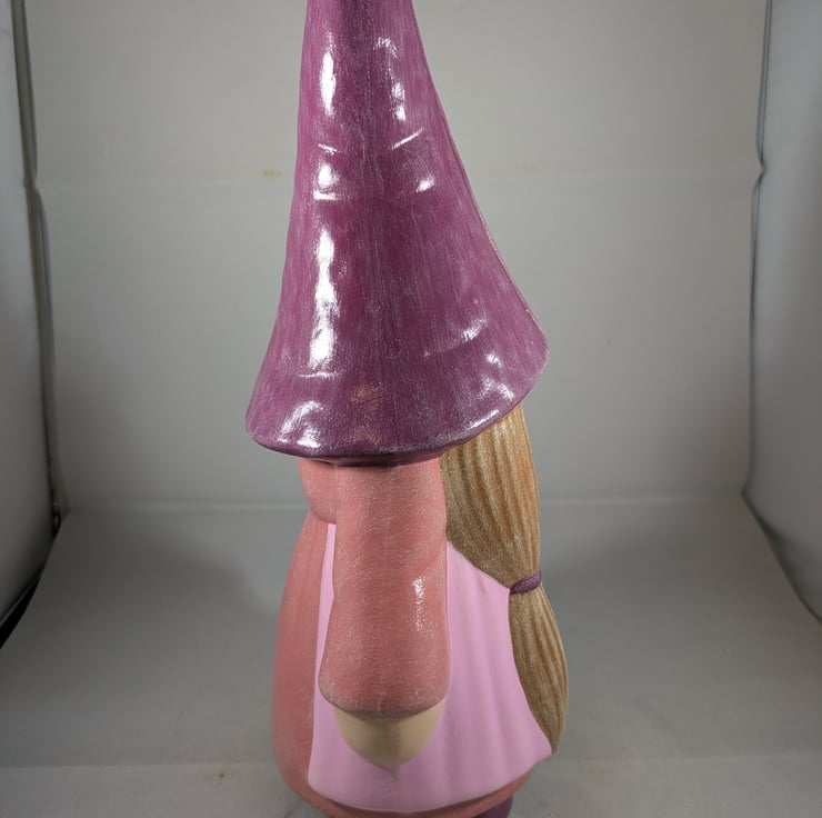 I have for sale a ceramic figurine ornament, which was hand painted by myself. It is a large freestanding gnome or gonk, dressed in a dress, apron, hat and shoes, all in different shades of pink colours. This would make a lovely addition to anyone's home, garden, patio or perhaps given as a gift.