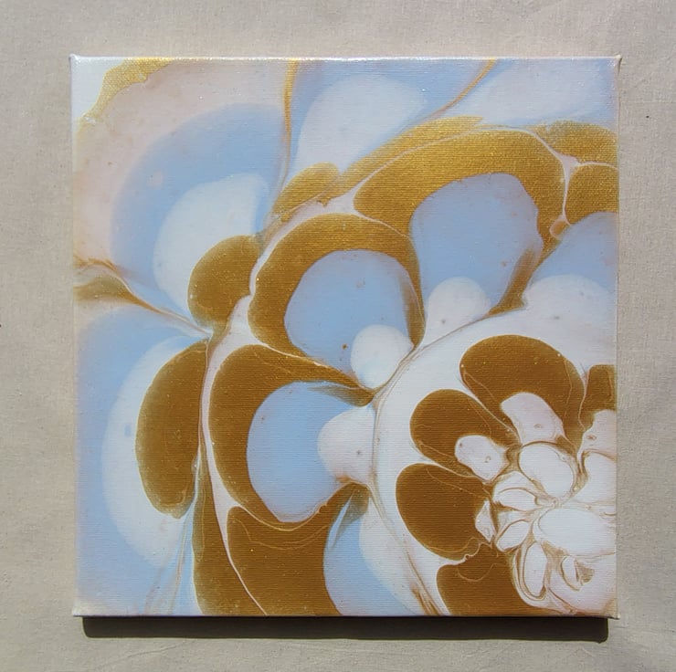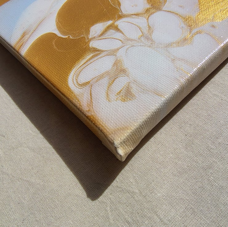 Acrylic Pour Canvas, with a white, gold and powder blue colour scheme. This canvas has been varnished with gloss varnish, will contain wedges for keeping canvas taught. The canvas size is W 30cm x H 30cm x D 1.5cm