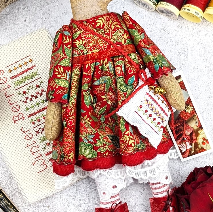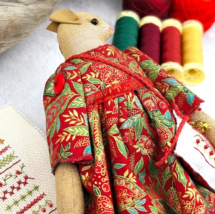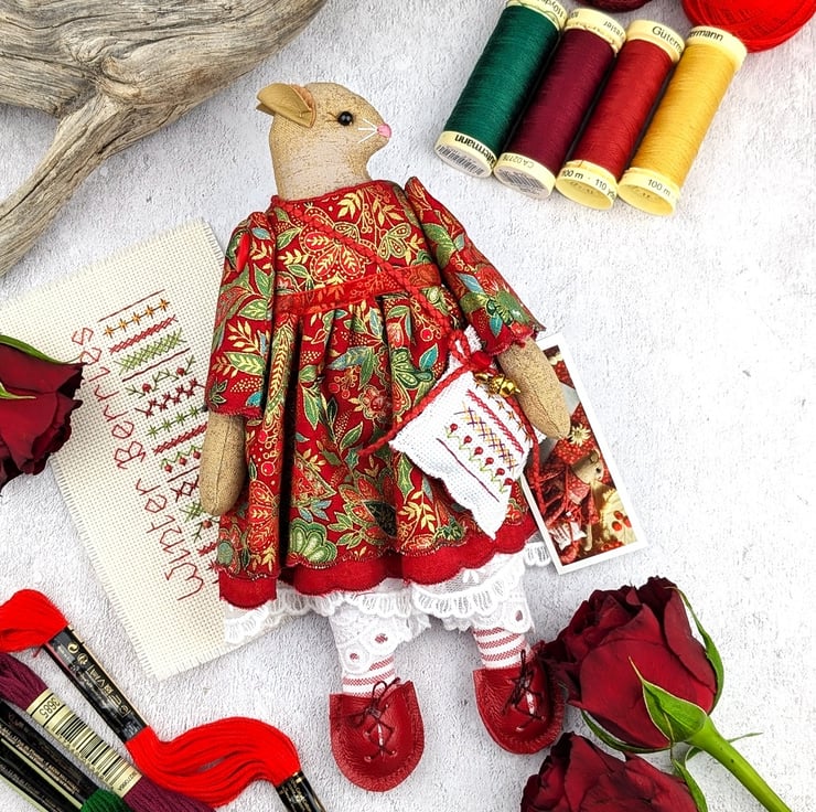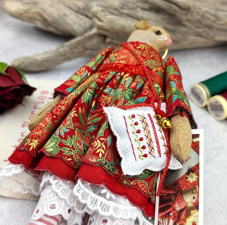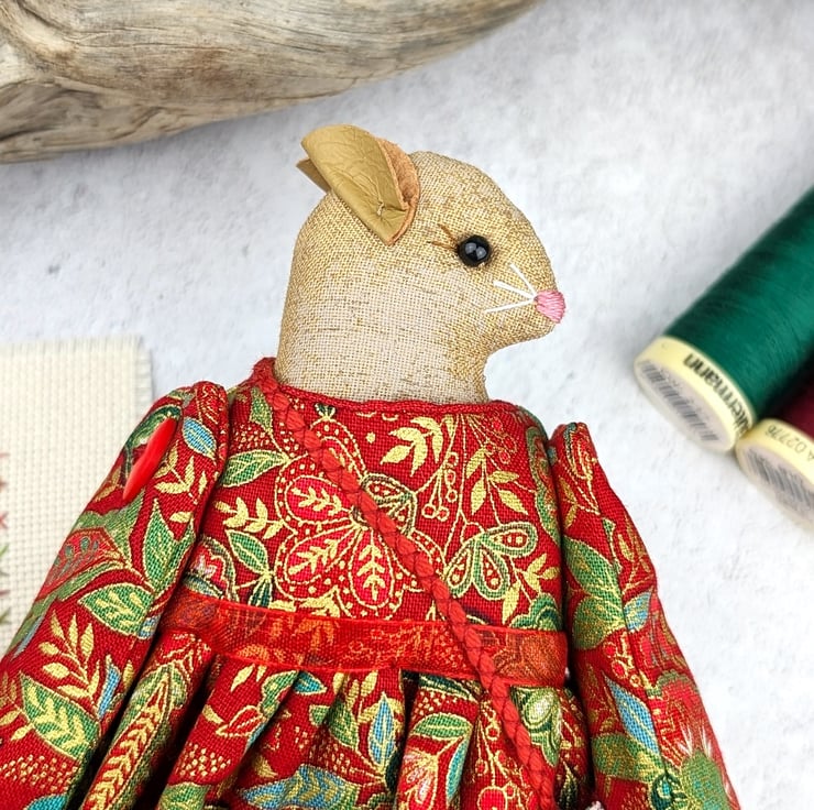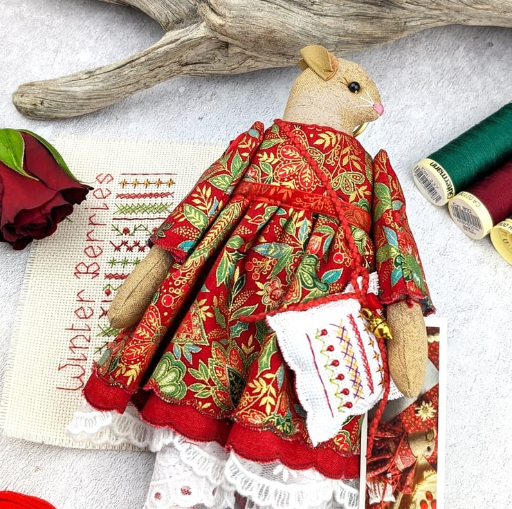This is Winterberry, a tiny winter berry Christmas mouse. She is a hand embroidered mouse with little leather ears and tail. She is dressed in a Christmas cotton from Makower called Good Tidings Sarasa Red She has coordinating underskirts in red cotton, white tulle mesh and white cotton lace bloomers. Her dress is finished with organza ribbon, tiny buttons and little leather shoes. She is a brown mouse with brown ears, a pink tail with white whiskers and a pink nose with little black bead eyes.
