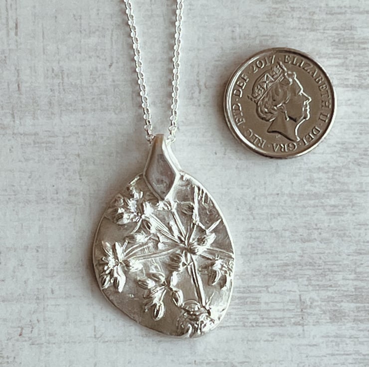 Silver pendant with impression of a dill seed head, with an organic look that reflects that it is a one off hand made piece. It is smooth with slight curves and an organic shape . Burnished and polished to create a very tactile piece with a soft slightly satin polish, One photo includes a five pence piece for scale - this pendant is considerably larger .